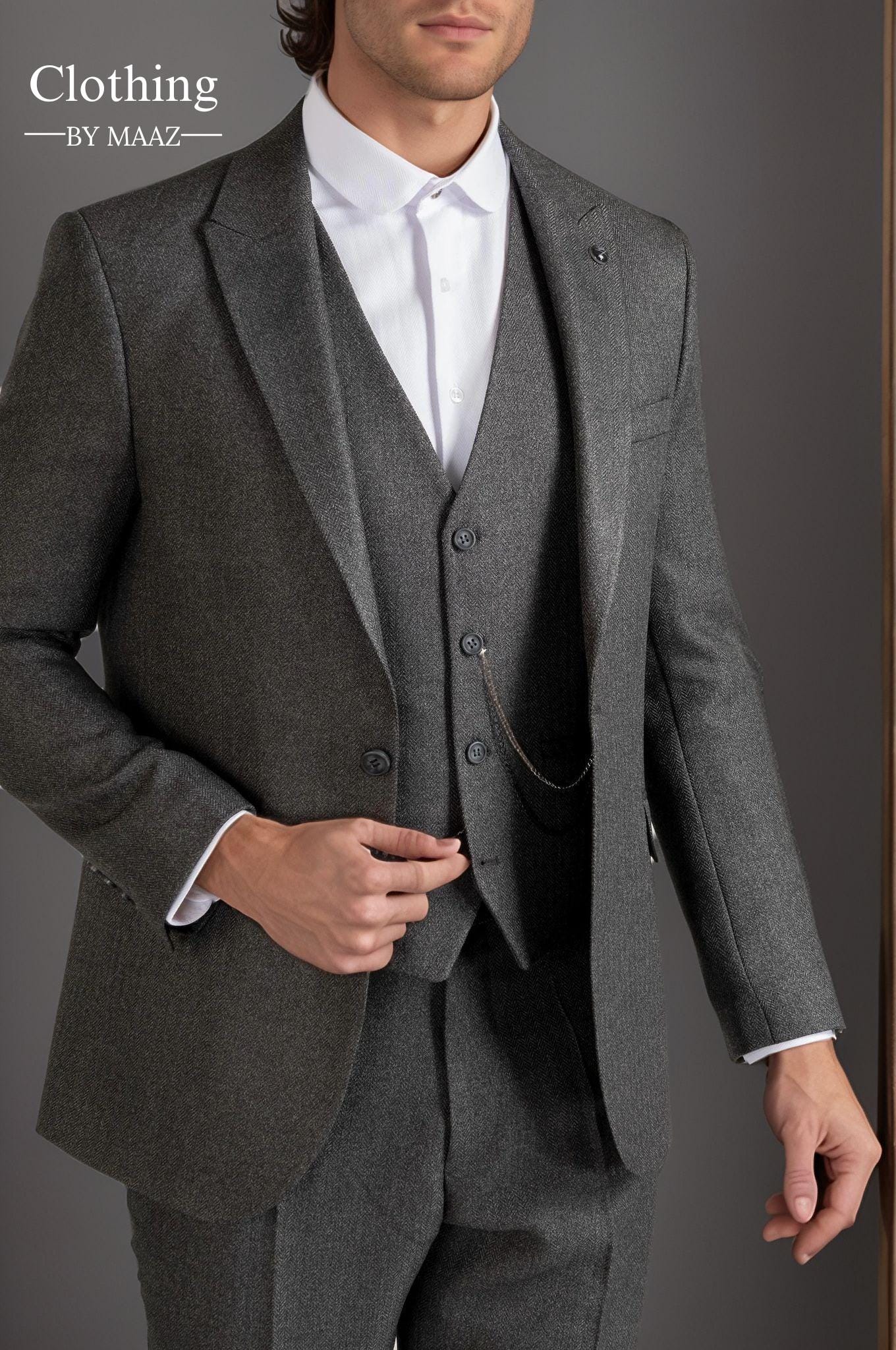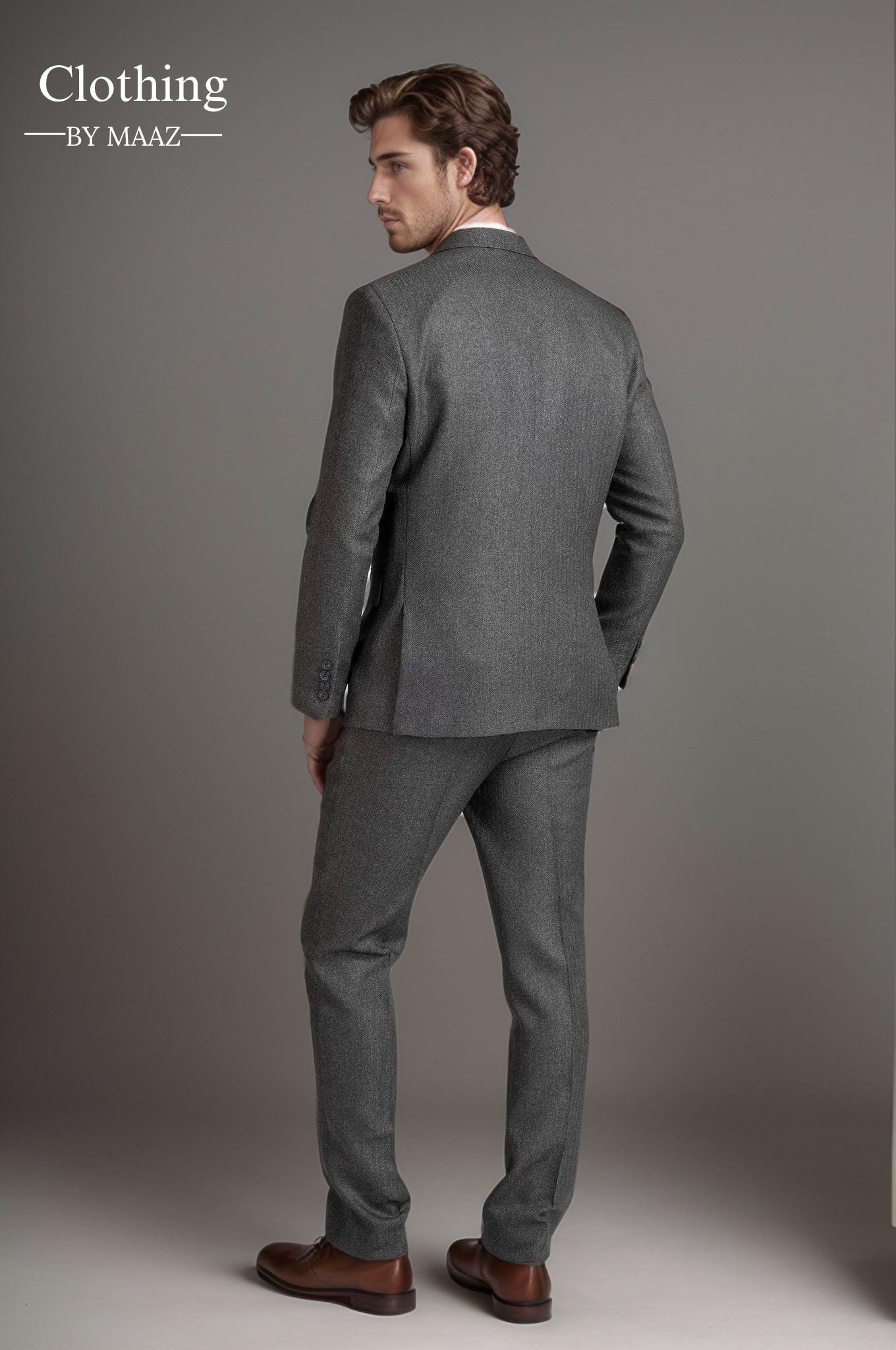 Grey Herringbone 3 Piece Suits for Men| Wedding Prom & Business Suit| Unique Three Piece Men's Suits| Clothing By Maaz