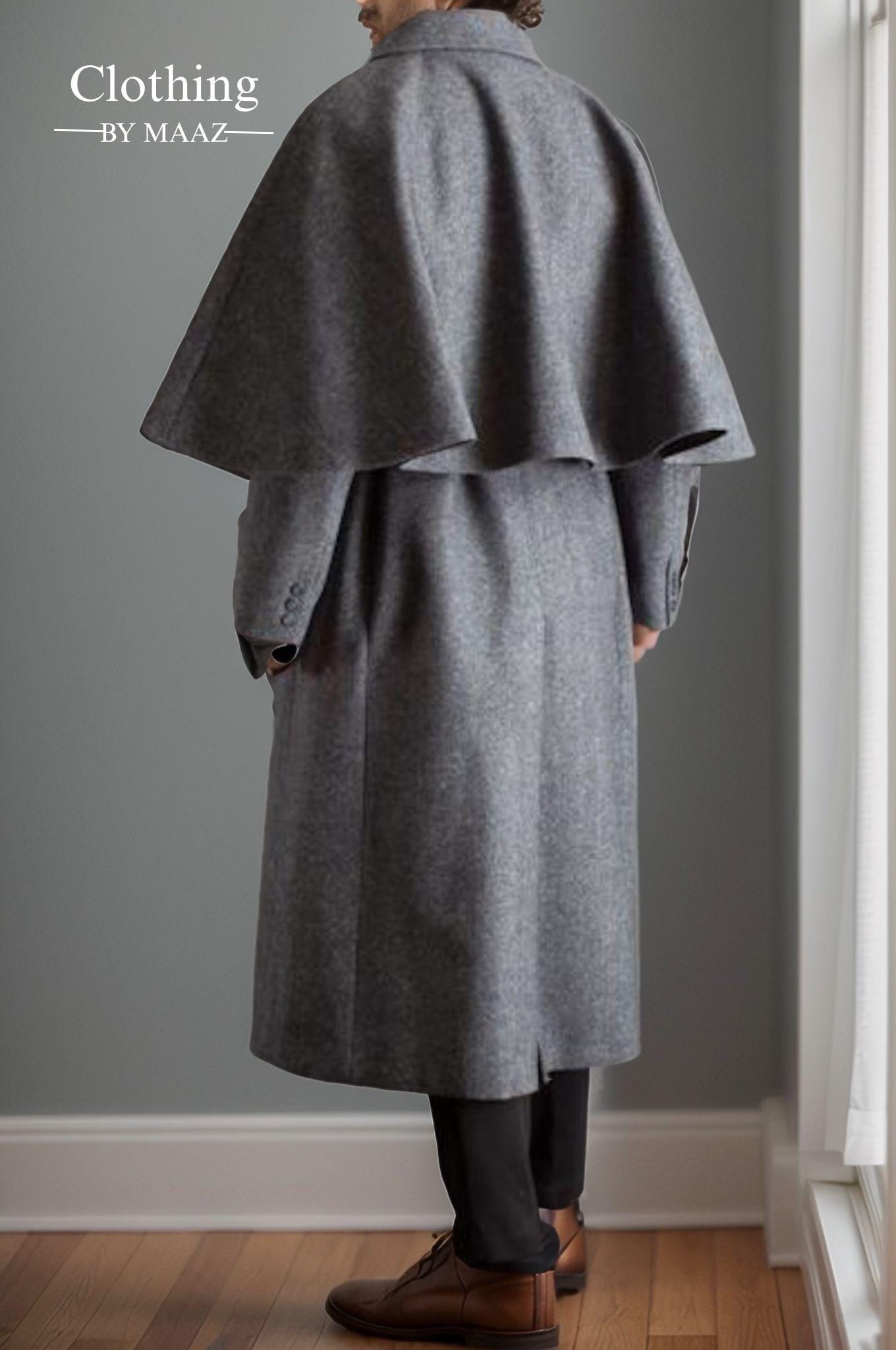 Handmade Men's Victorian Long Gray Inverness Cape Coat | Perfect Halloween| Winter Outerwear| Clothing By Maaz