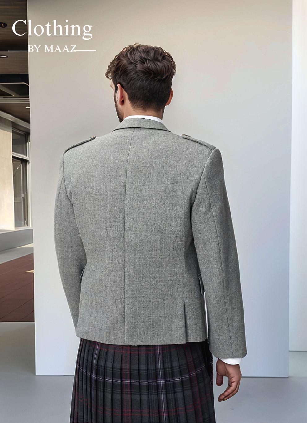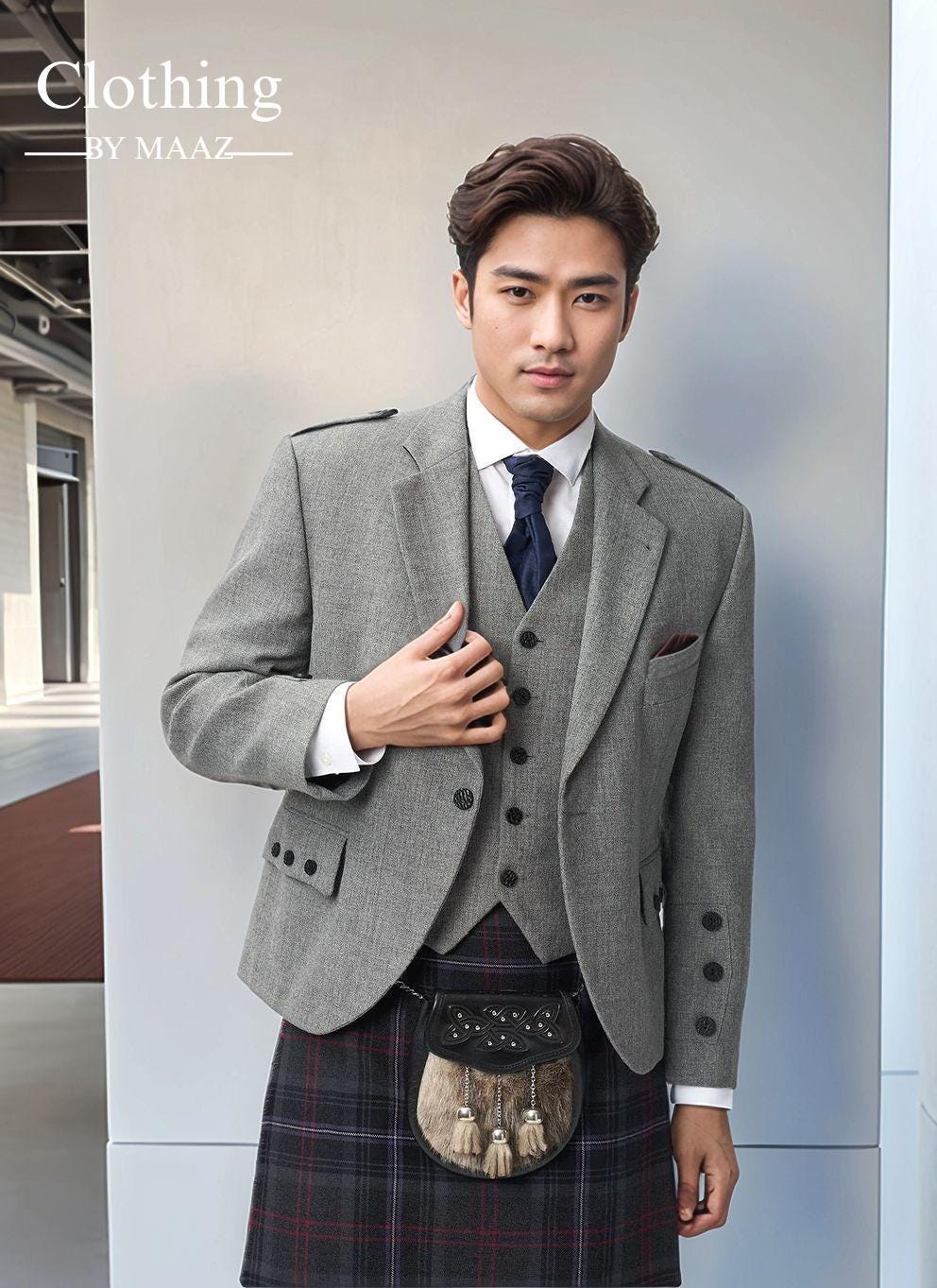 Scottish Men's Gray Tweed Jacket | Handmade Wool Wedding Coat| Kilt Jacket With 5 Buttons Vest | Clothing By Maaz