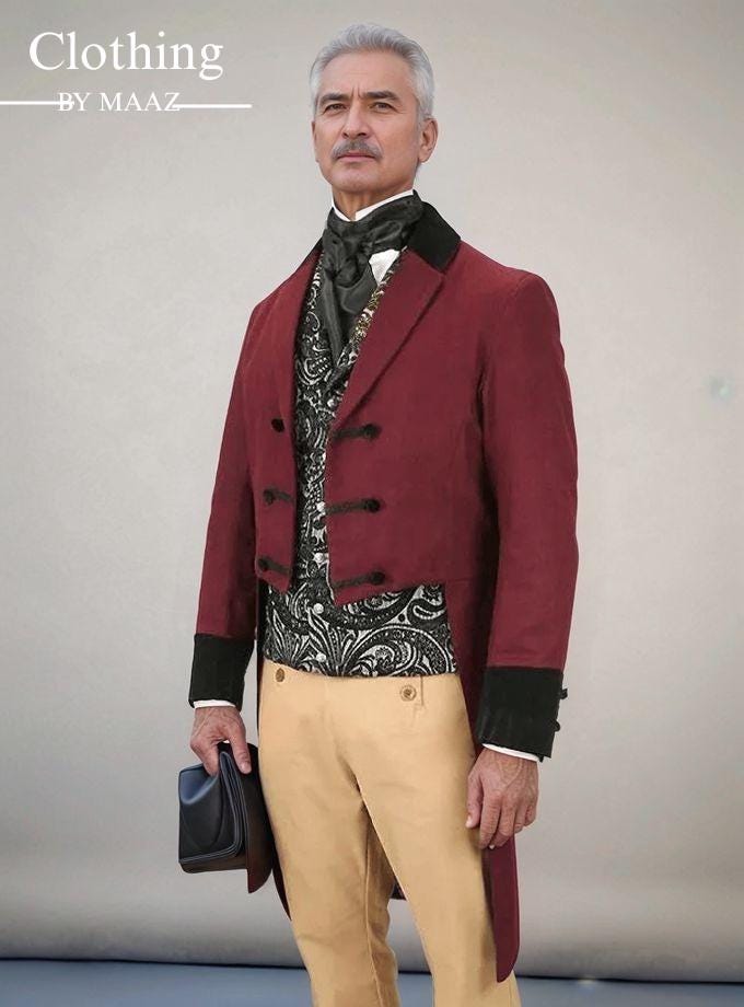 Handmade Men's Regency Tailcoat! It truly evokes the splendor and poise of a bygone era The dramatic cut-away front and the long, pleated tails conjure an image of a confident, commanding figure striding into a ballroom or a gentleman's parlor. The intricate details—braided trim, velvet accents on the collar and cuffs—add just the right amount of opulence, without tipping over into excess.