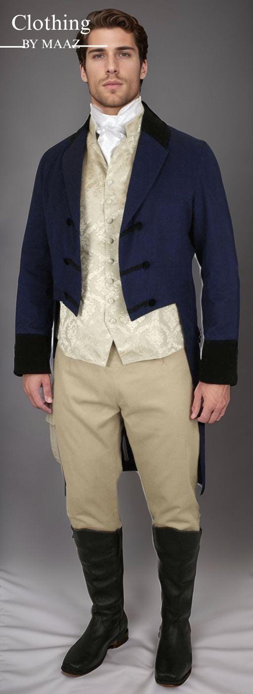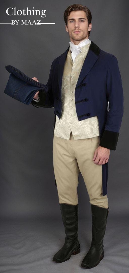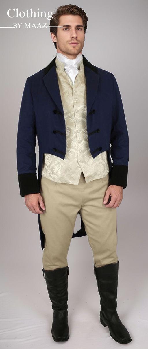 Custom Fit Style: Tailored to provide a sharp, flattering silhouette that enhances your appearance. The fit is designed to reflect the elegance of the Regency era.