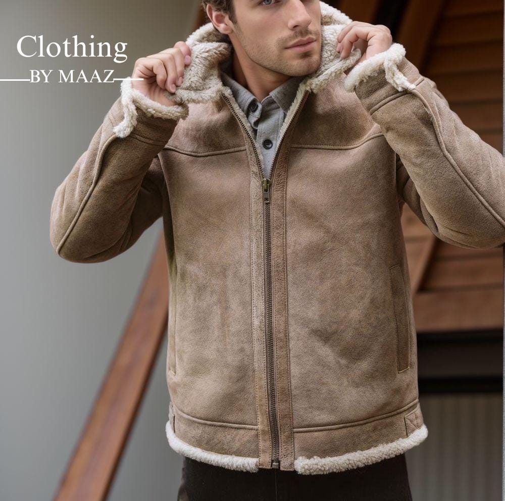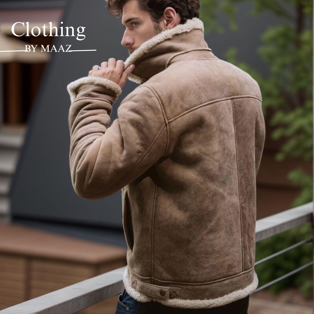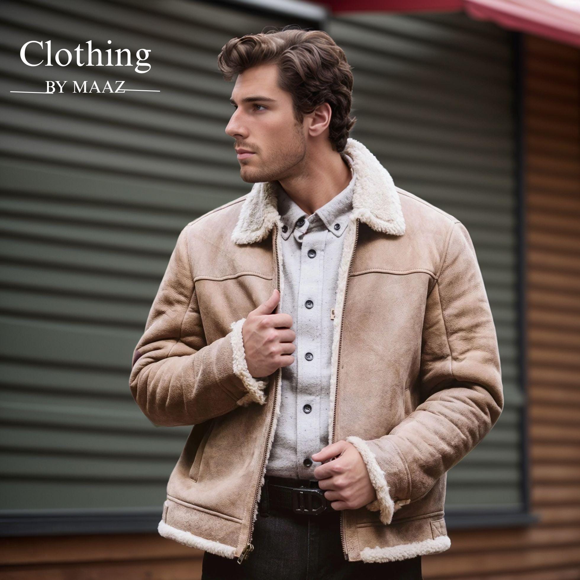 Handmade Men Shearling Leather Sandstone Brown Bomber Jacket | Handmade Military Style | Men's Outerwear| Clothing By Maaz
