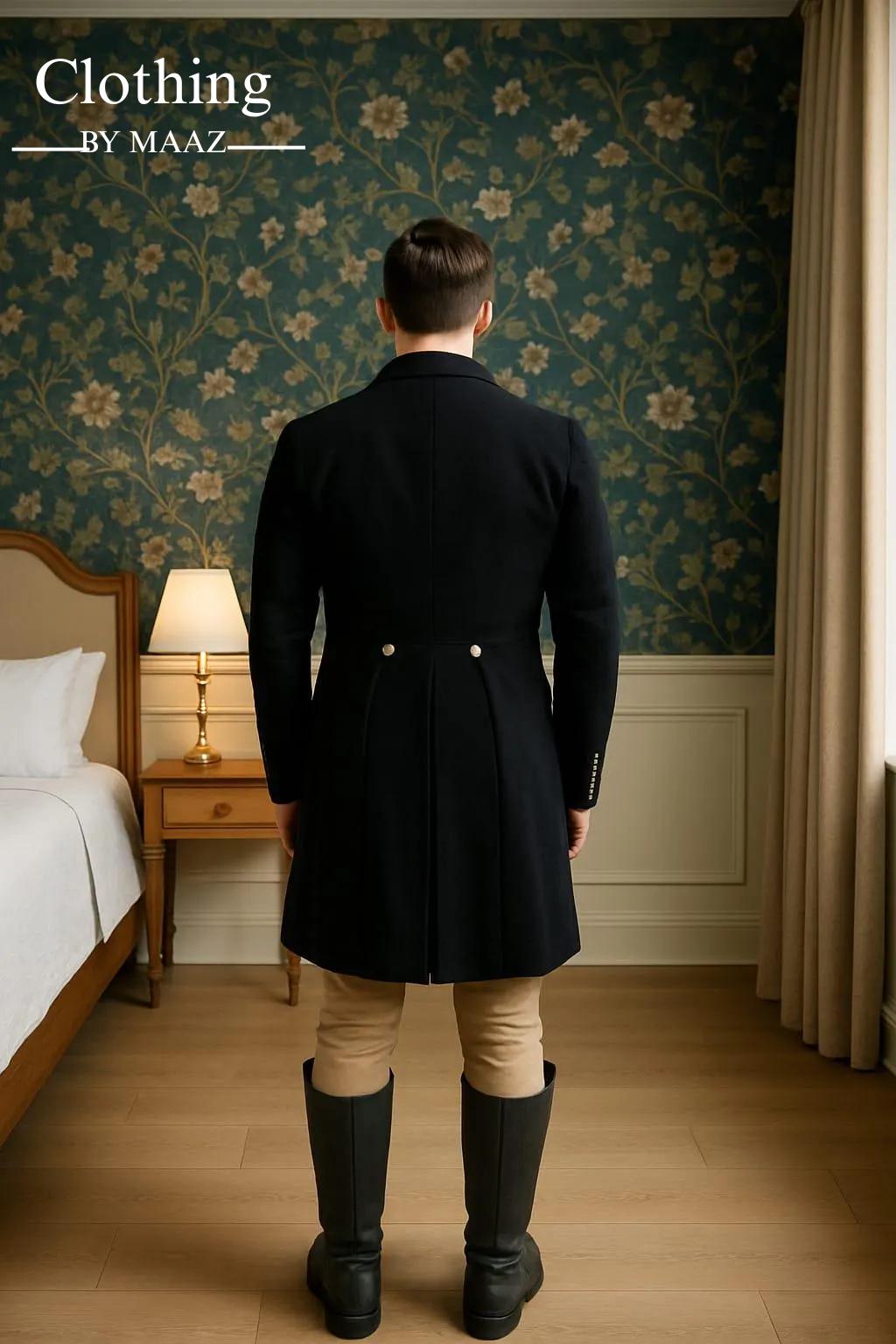 Men's Regency Coat in a refined black wool. Inspired by early 19th-century fashion, this double-breasted tailcoat is designed to reflect the sophistication and charm of classic Regency menswear. Perfect for historical reenactments, period-themed weddings, theater productions, or formal occasions, this coat combines historical accuracy with modern craftsmanship for a polished, high-quality.