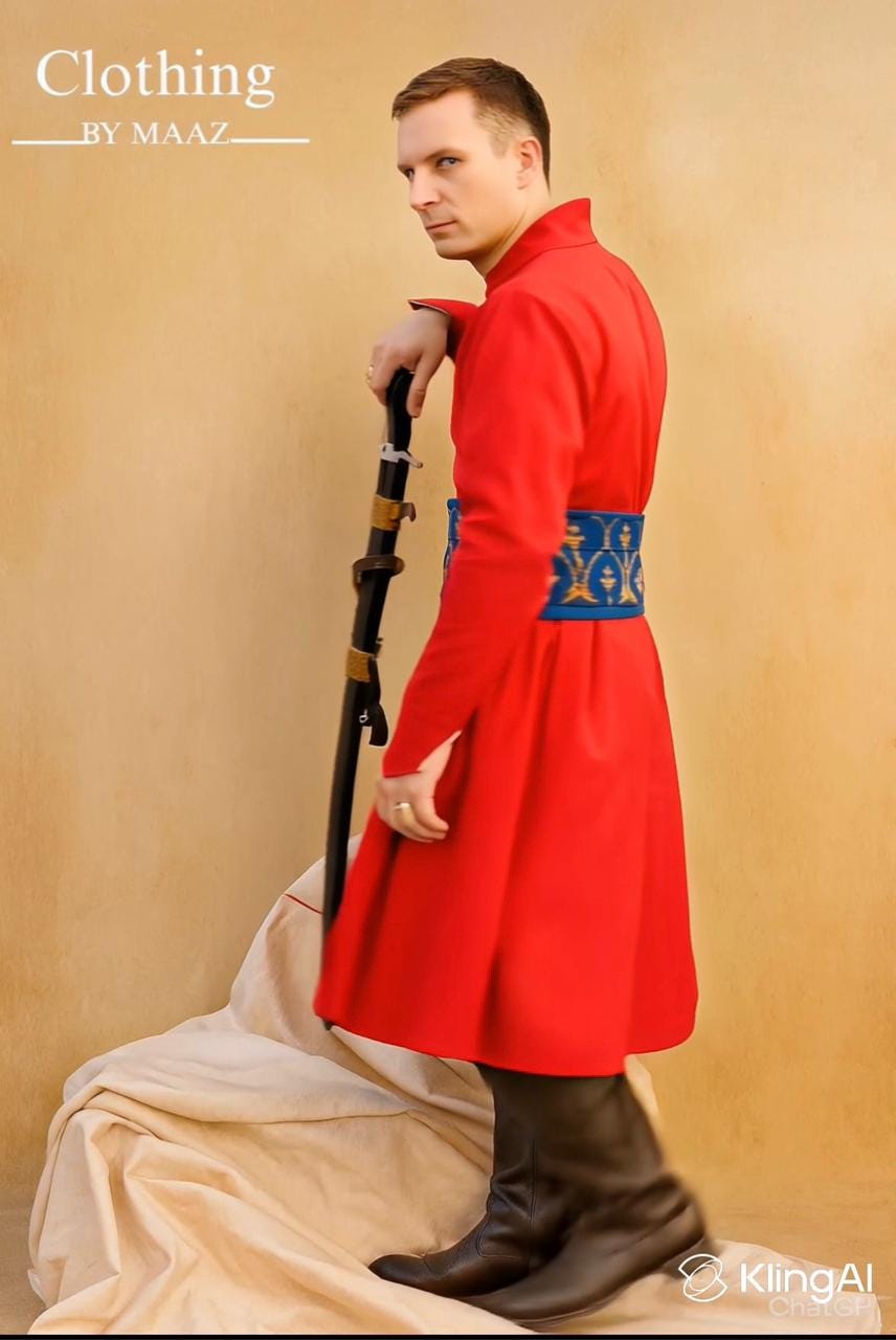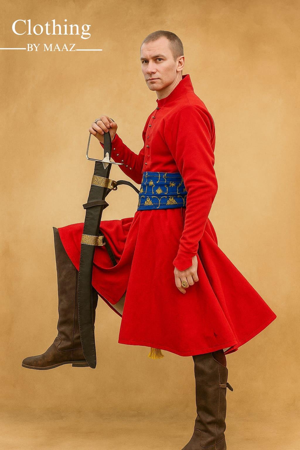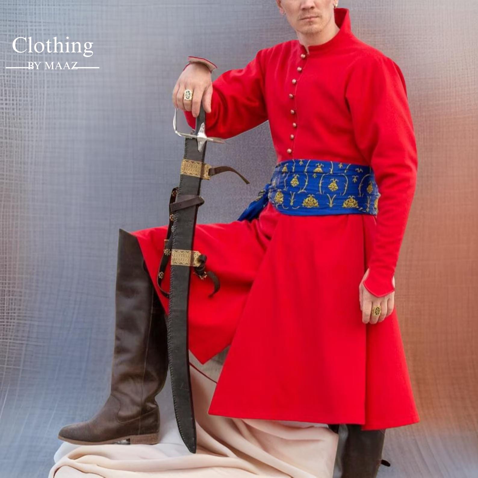 Men's Red Medieval Cossack Wool Russian War Mental Zupan Long Cossack Coat , Long Wool Frock Coat Men Russian Costume, Clothing By Maaz