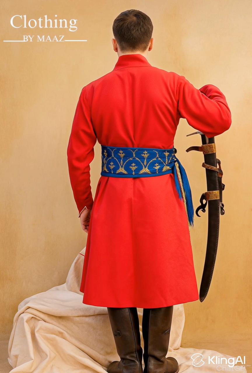 The Men's Red CHERKESKA Russian Cossack Coat is a striking reproduction of a traditional 19th-century Cossack frock coat, designed with historical accuracy and fine craftsmanship.