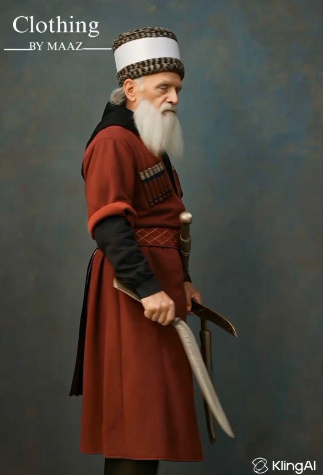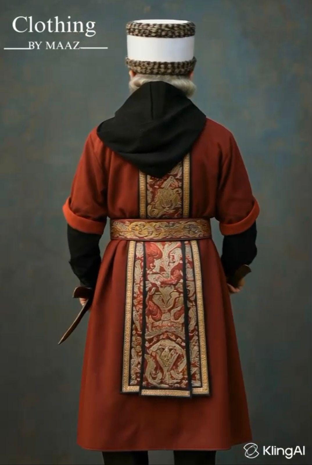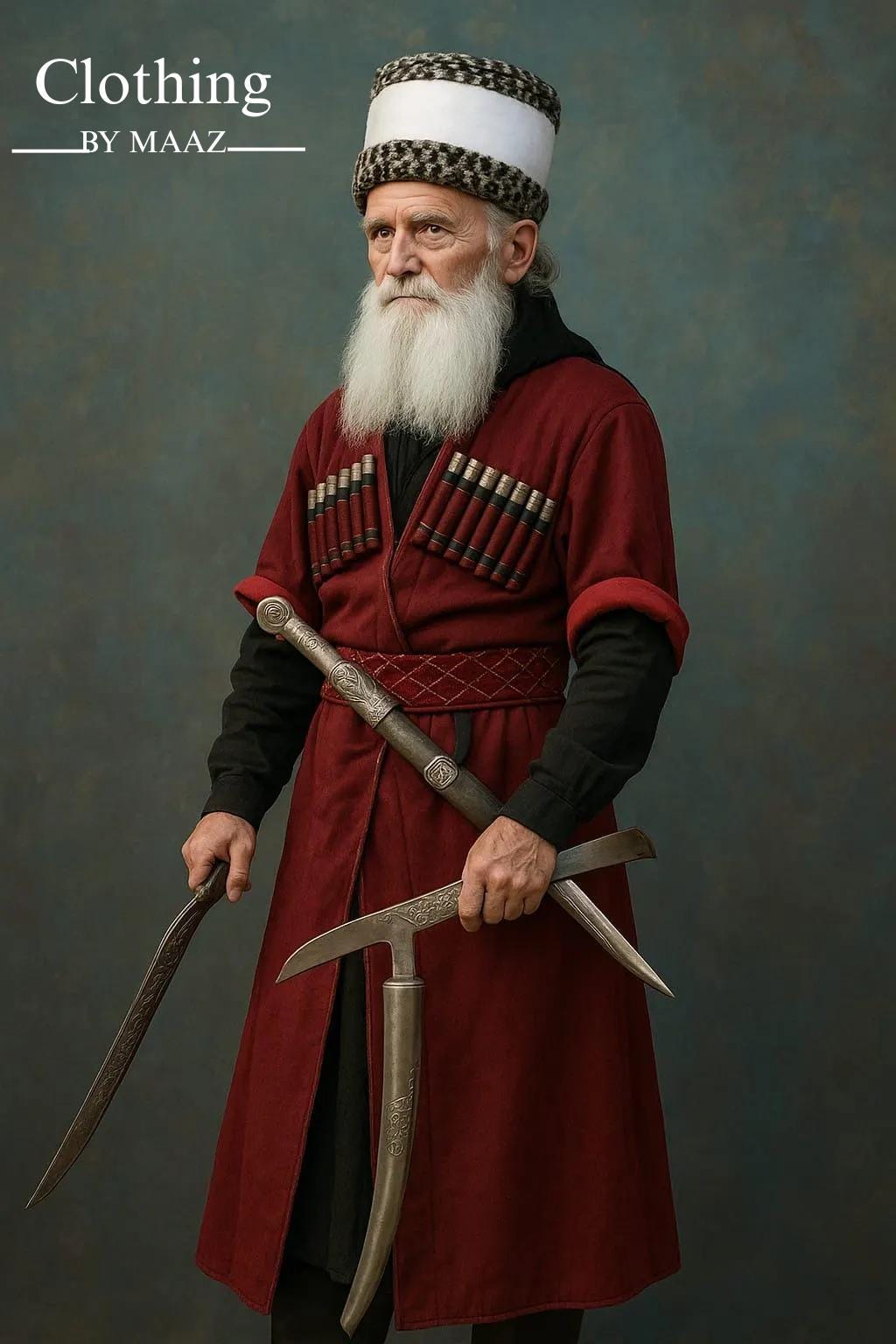 The Men's Dark Red Great Chokha 1 Georgian Clothing Cossack Chokha Coat is a striking reproduction of a traditional 19th-century Cossack frock coat, designed with historical accuracy and fine craftsmanship.