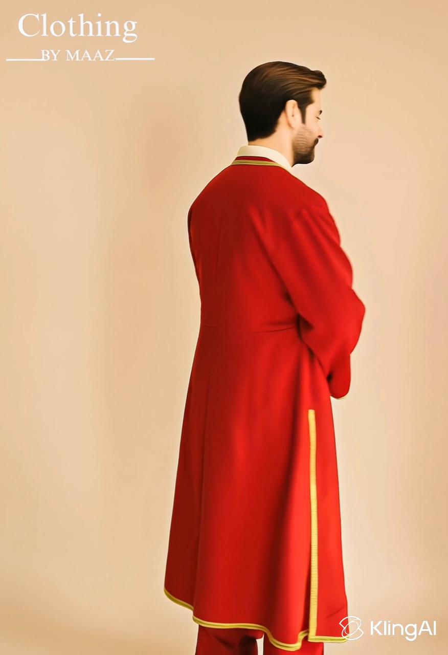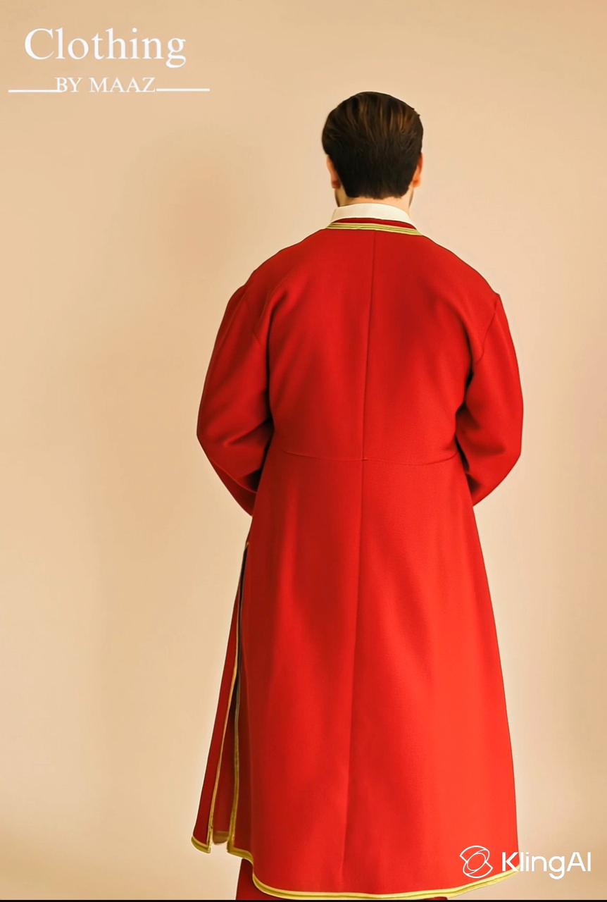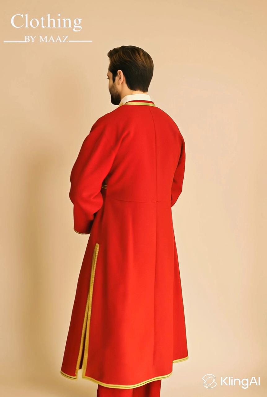 Men's Red Cossack Wool Coat, Gold Braiding, Russian Costume