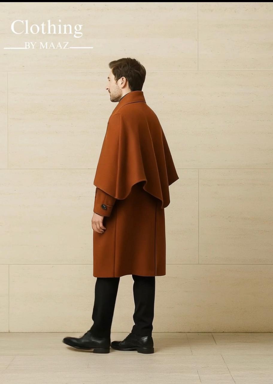 The Men's brown wool cape coat is a timeless and versatile piece that seamlessly merges Victorian-inspired elegance with modern practicality. Its standout feature is the double-layer design, highlighted by the iconic cape that drapes gracefully over the shoulders, creating a striking silhouette that exudes sophistication. This design not only adds a dramatic flair but also provides additional warmth and protection from the elements, making it both stylish and functional.