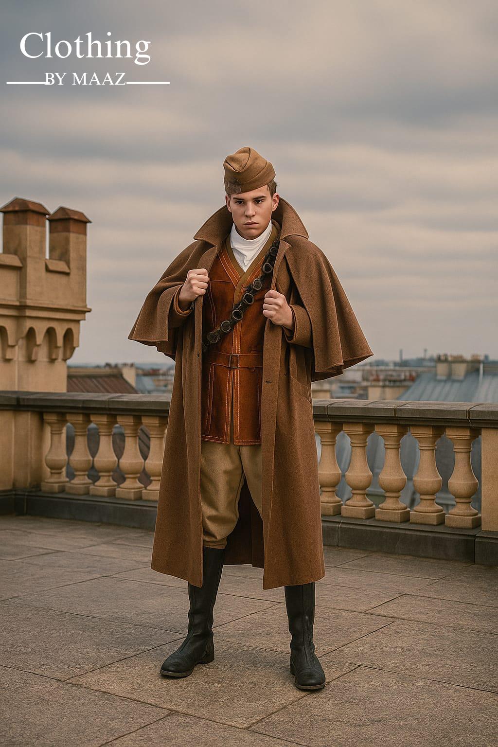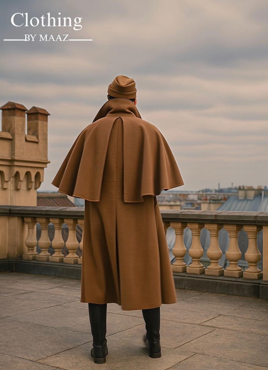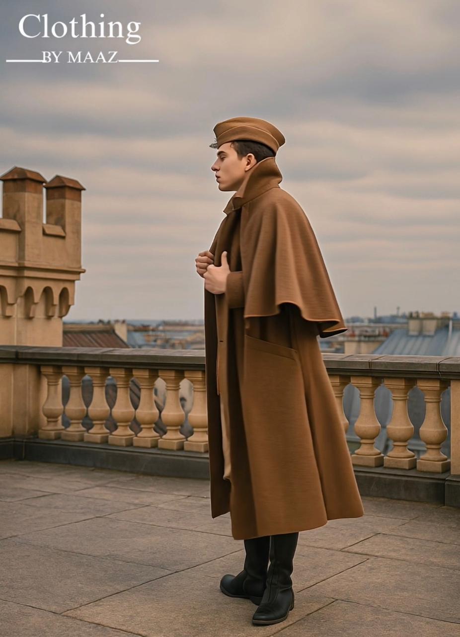 The Men's brown wool cape coat is a timeless and versatile piece that seamlessly merges Victorian-inspired elegance with modern practicality. Its standout feature is the double-layer design, highlighted by the iconic cape that drapes gracefully over the shoulders, creating a striking silhouette that exudes sophistication. This design not only adds a dramatic flair but also provides additional warmth and protection from the elements, making it both stylish and functional.