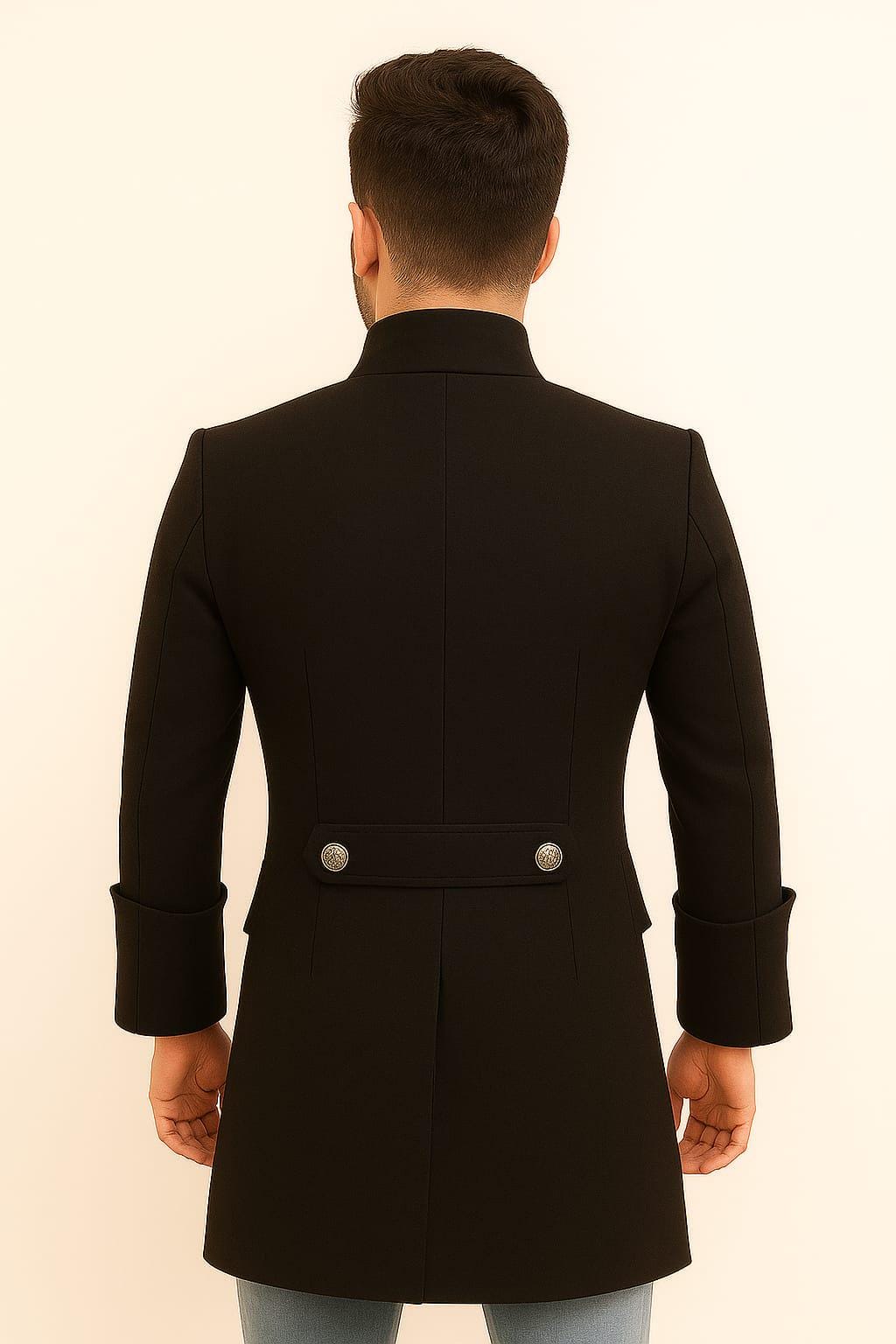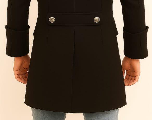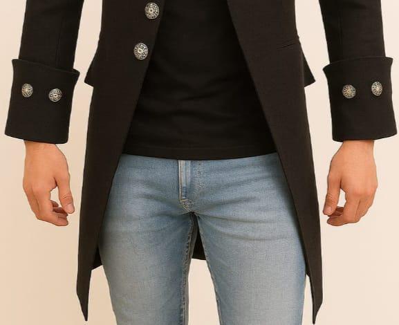 Step into timeless elegance with this Men’s Black Tailcoat Jacket, designed with a striking Victorian-inspired silhouette and metal statement buttons. This long military-style coat blends classic gothic fashion with modern sophistication, perfect for men who want to stand out with bold confidence.
