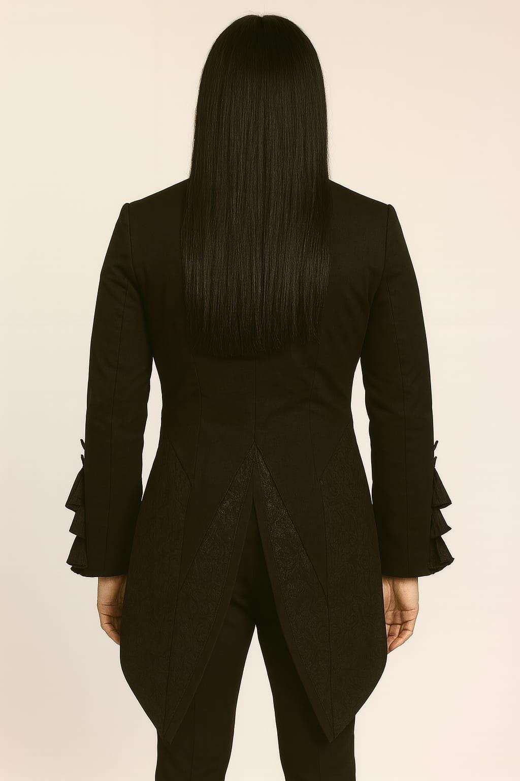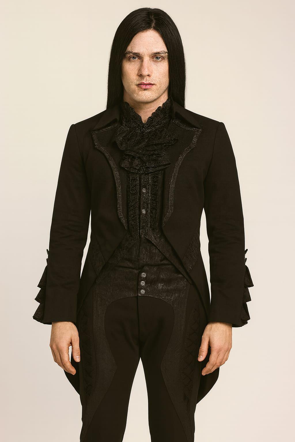 Step into timeless darkness and elegance with this Men’s Gothic Victorian Tailcoat Outfit, designed for those who embrace dramatic fashion, vintage aesthetics, and premium craftsmanship. This all-black ensemble features a finely detailed Victorian tailcoat, ornate textured fabric, a ruffled gothic shirt, and matching period-style trousers—creating a powerful, mysterious, and luxurious look.