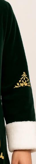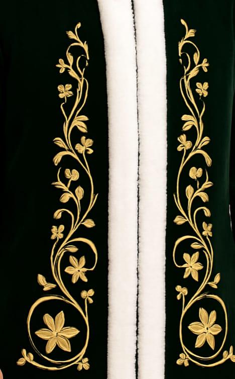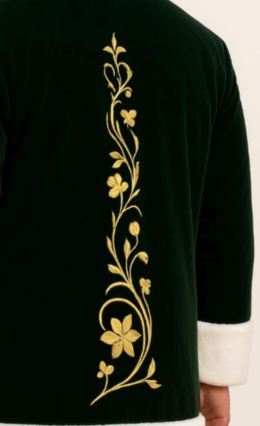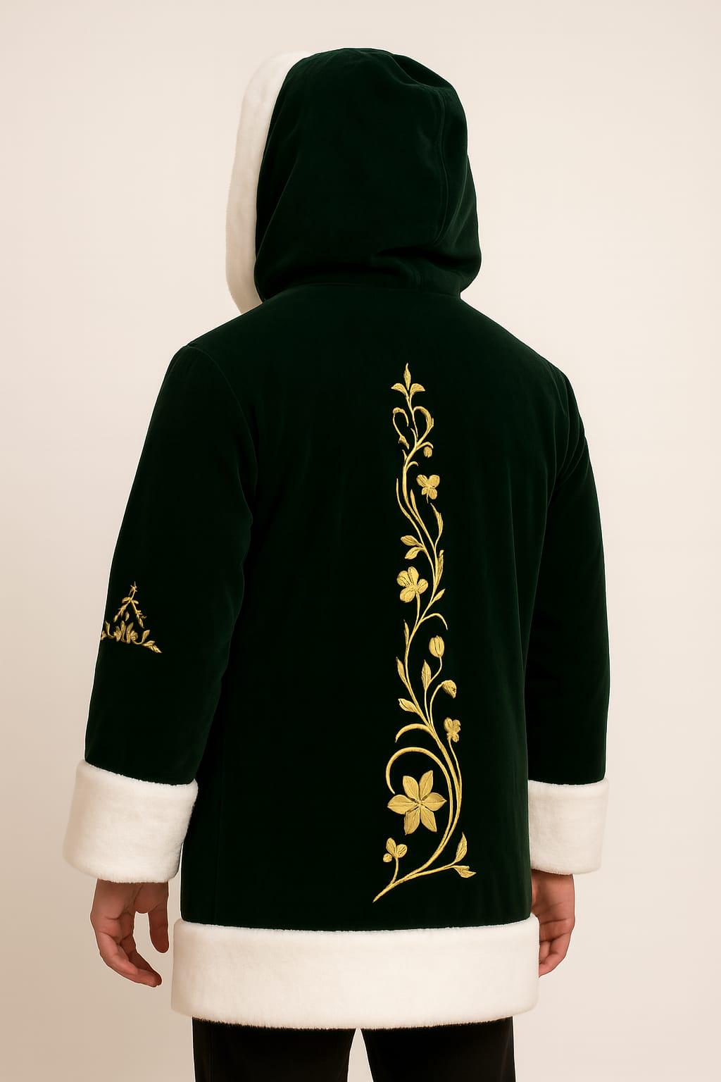 Bring elegance, warmth, and artistry to your winter wardrobe with this luxurious men’s velvet embroidered coat. Crafted in a deep forest-green velvet and finished with a plush white faux-fur trim, this hooded coat blends classic winter charm with detailed golden embroidery inspired by floral and medieval patterns.