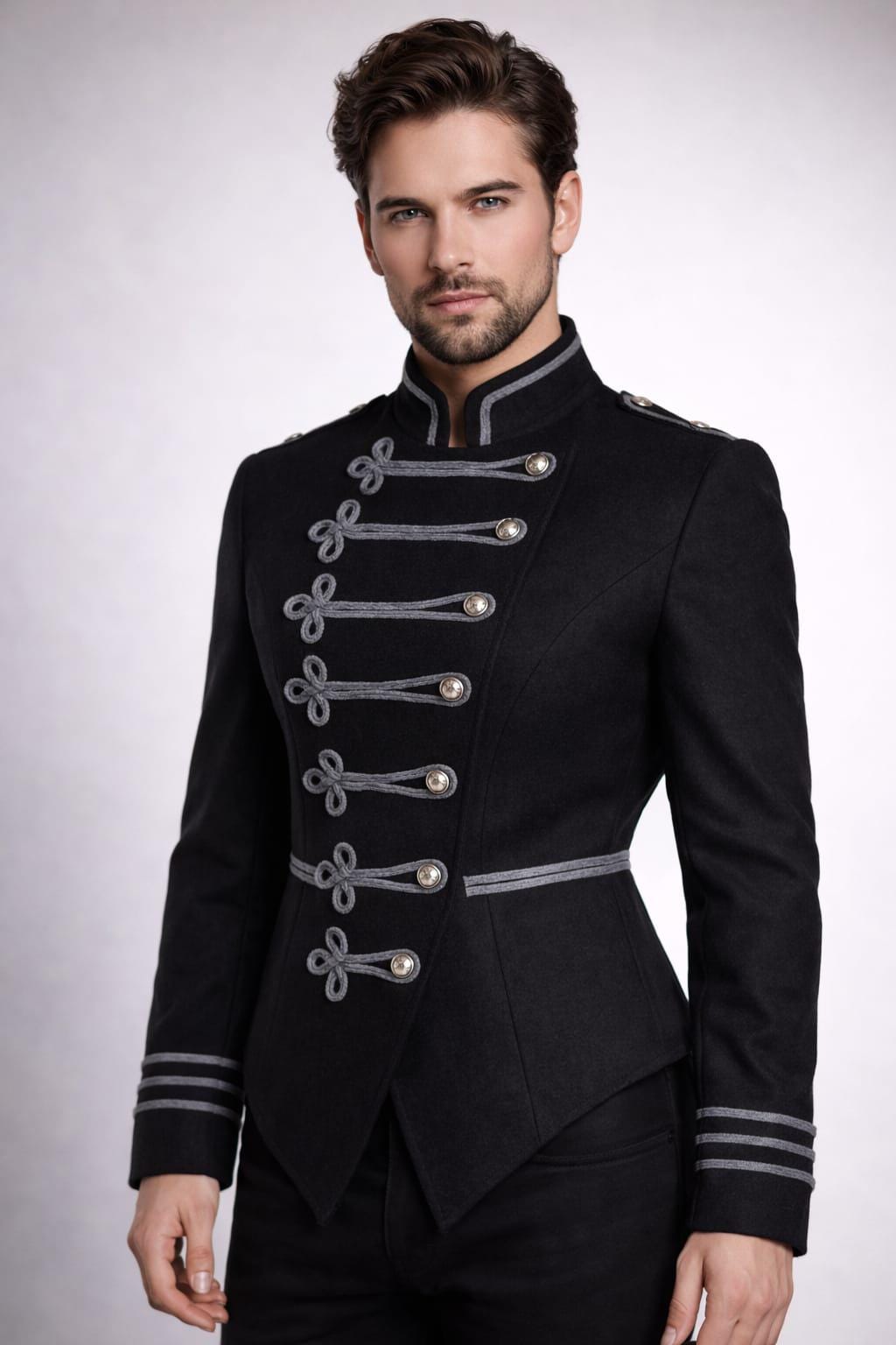 Elevate your style with this Men’s Victorian Military Jacket, inspired by classic 19th-century Victorian and European military fashion. Designed with a tailored slim fit, this black coat features elegant frog closures, silver buttons, and refined piping, creating a bold yet sophisticated look.