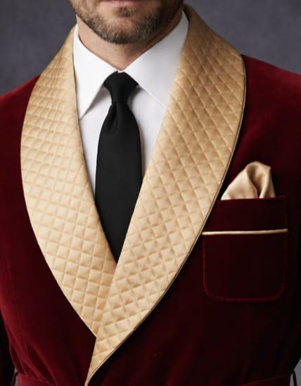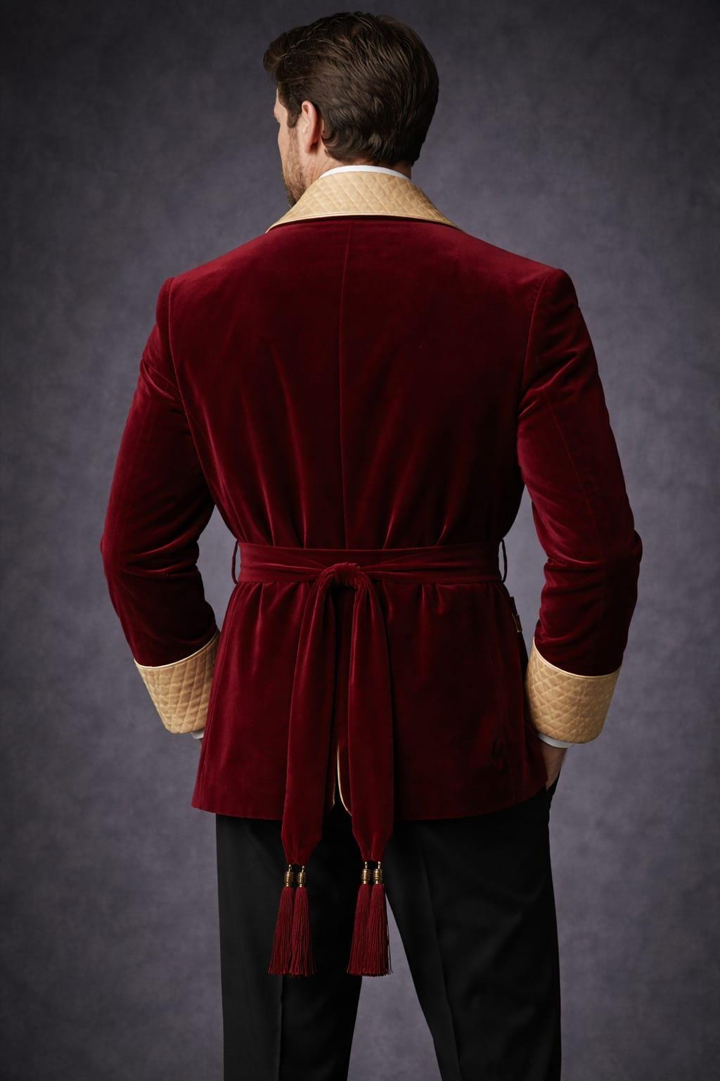 Elevate your formal wardrobe with this luxury men’s burgundy velvet smoking jacket, designed for gentlemen who appreciate classic Victorian elegance and modern sophistication. Crafted from rich velvet fabric, this statement piece features a quilted gold shawl collar, matching cuffs, and a refined robe-style belt closure that delivers both comfort and aristocratic charm.