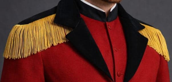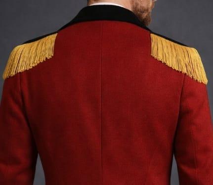 The coat showcases gold braided button closures, gold fringe epaulettes, and a sharp swallow tail back design, making it ideal for anyone seeking a luxury statement coat with royal appeal.