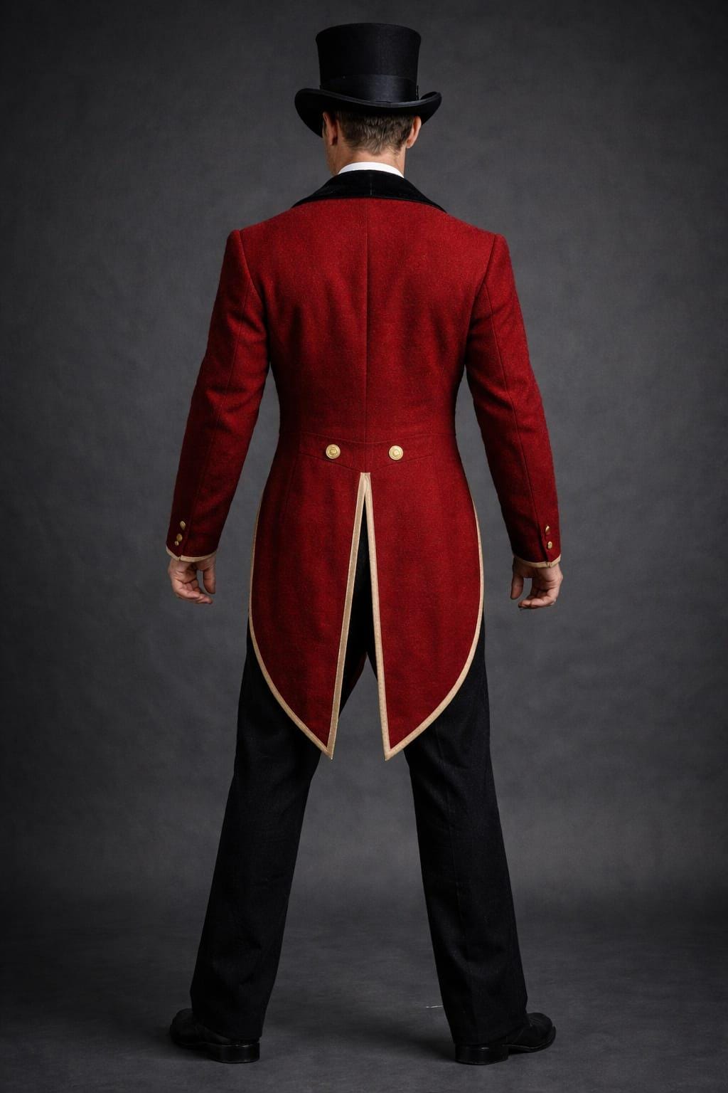 Step into timeless elegance with this Victorian-inspired Ringmaster Red Tailcoat, crafted for men who appreciate bold historical fashion. Designed with a luxurious wool texture, this coat features a structured silhouette, elegant gold piping, and a dramatic split back tail — perfect for making a powerful statement.