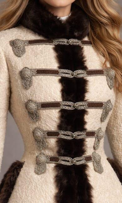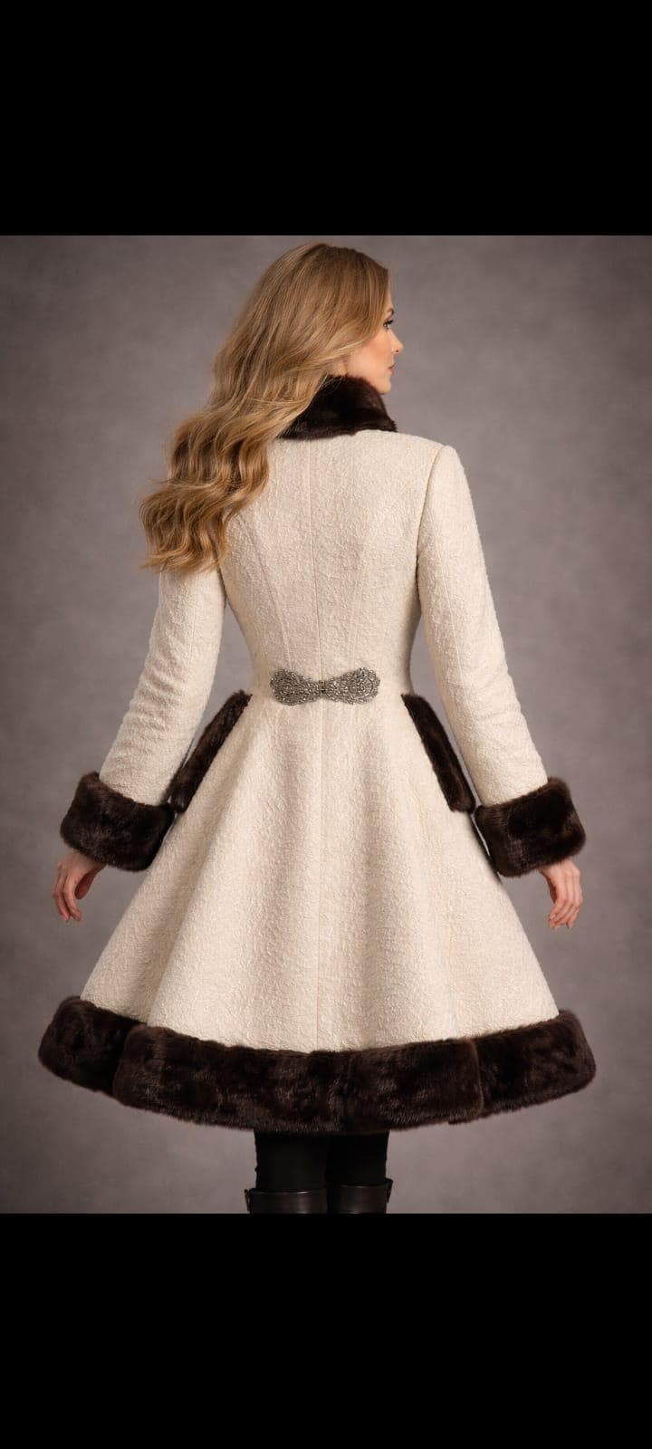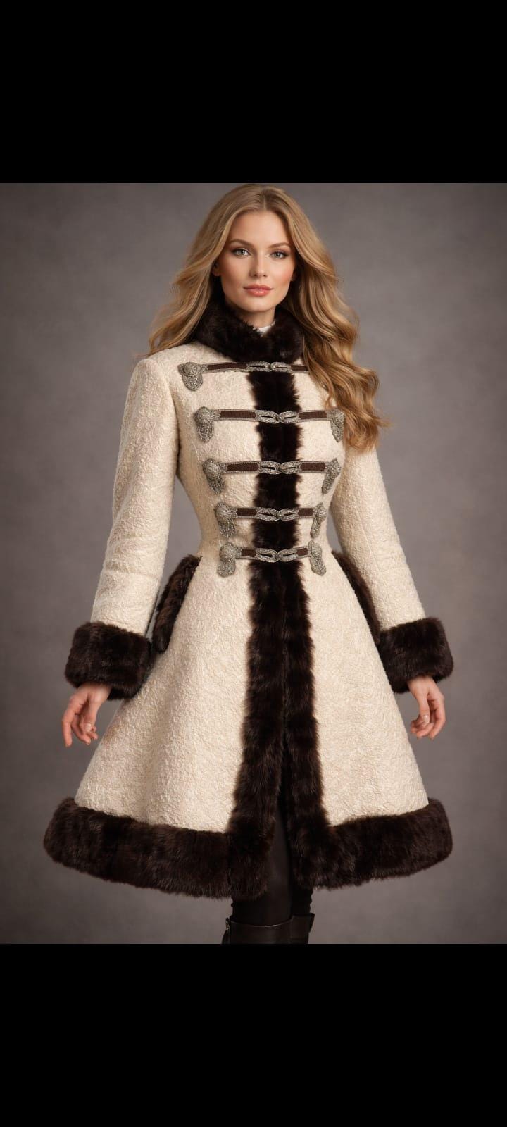 Step into timeless elegance with this luxury Victorian-inspired wool coat, designed for women who love classic sophistication and premium winter fashion. Featuring a beautiful off-white textured fabric, rich faux fur trim, and ornate front closures, this coat delivers warmth, style, and royal charm.