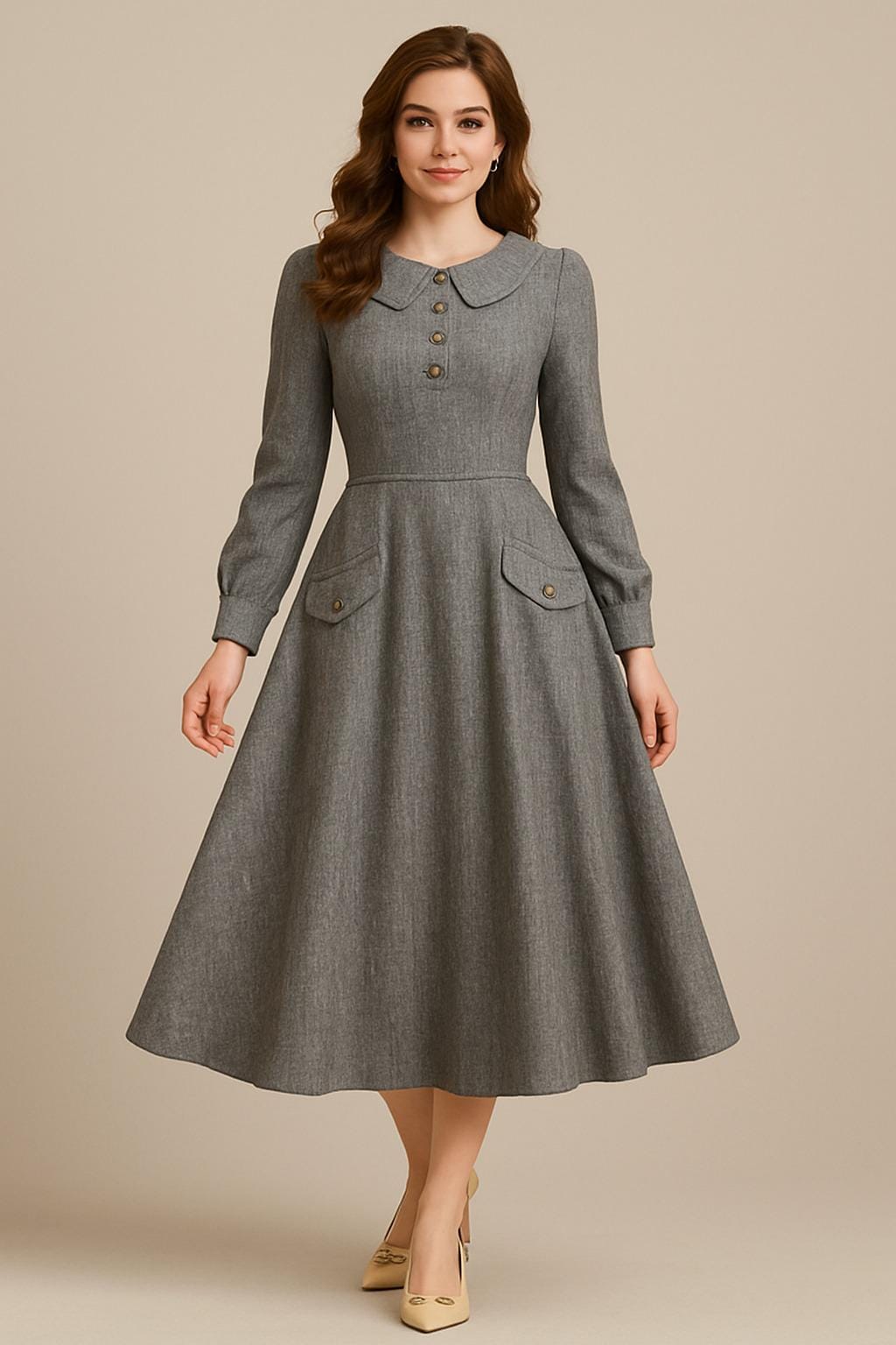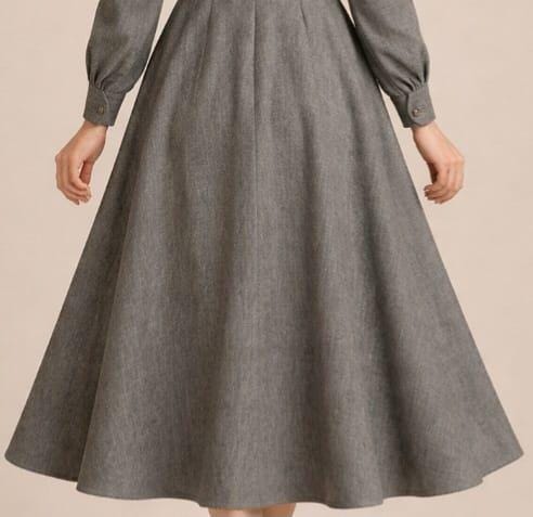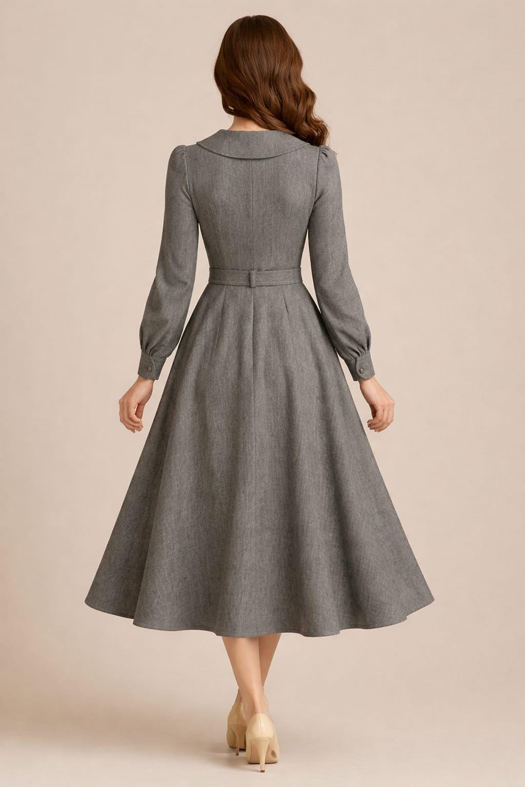 Step into timeless elegance with this Victorian-inspired wool dress coat, designed for women who love classic vintage fashion with a refined silhouette. Crafted in a soft grey wool blend, this long-sleeve A-line midi coat dress features a tailored bodice, decorative front buttons, and a beautifully flared skirt that creates a flattering, feminine shape.