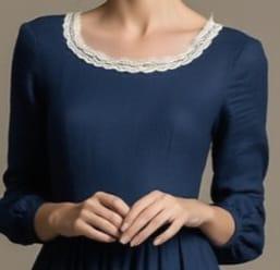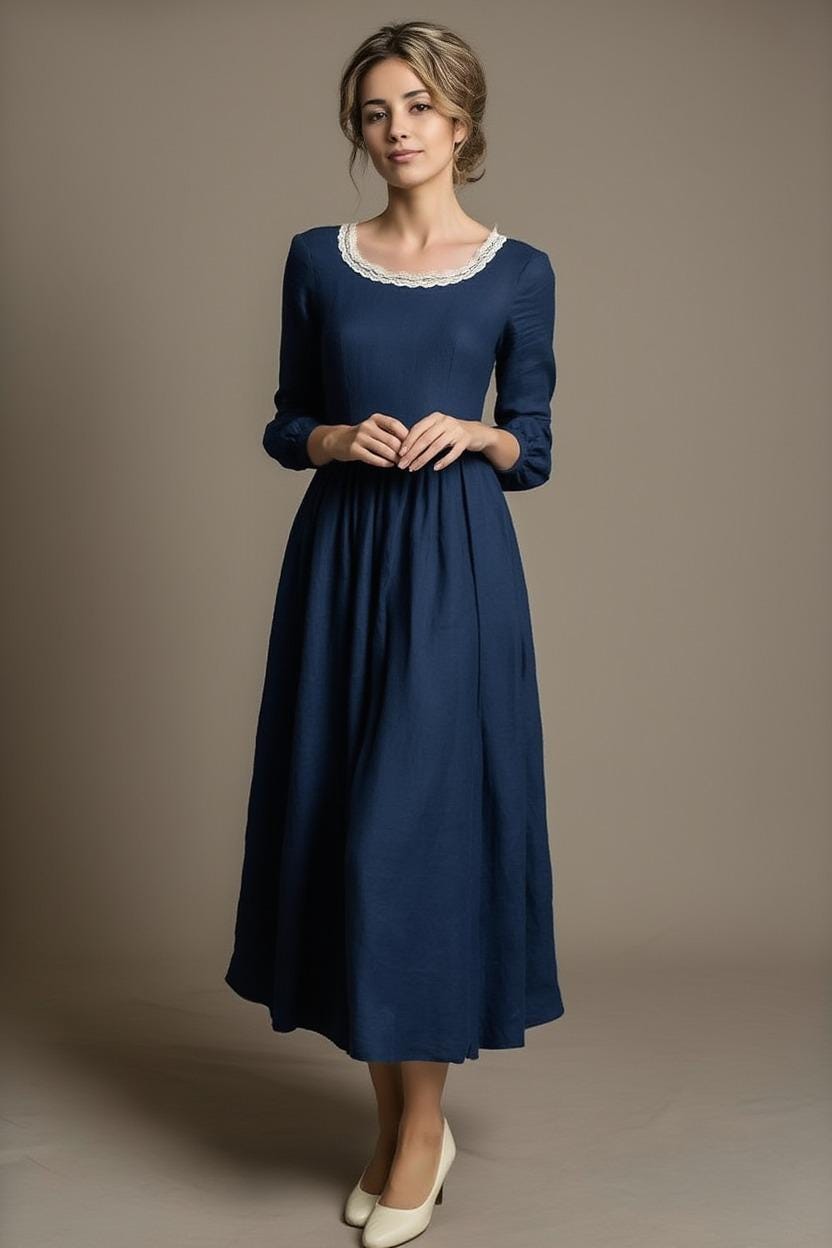 Embrace timeless elegance with this Edwardian-inspired blue maxi dress, designed for lovers of vintage fashion, cottagecore style, and modest historical clothing. Featuring a graceful scoop neckline with delicate lace trim, long fitted sleeves, and a flowing A-line skirt, this dress captures the refined beauty of early 20th-century fashion.