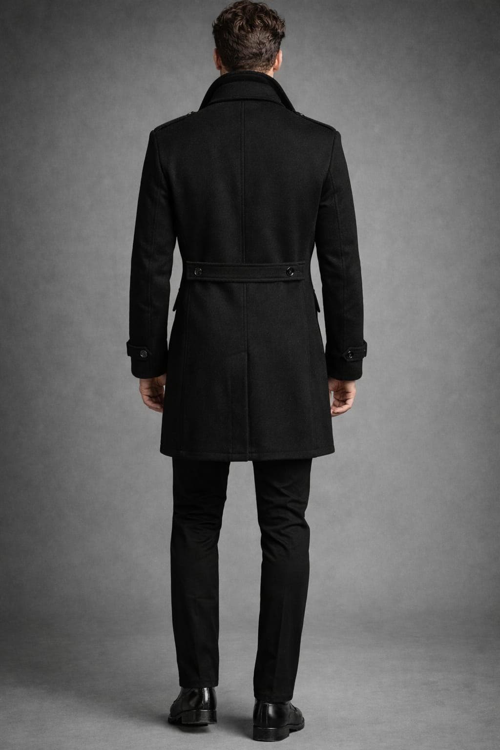 Men's Black Wool Double Breasted Overcoat, Slim Fit Trench Coat