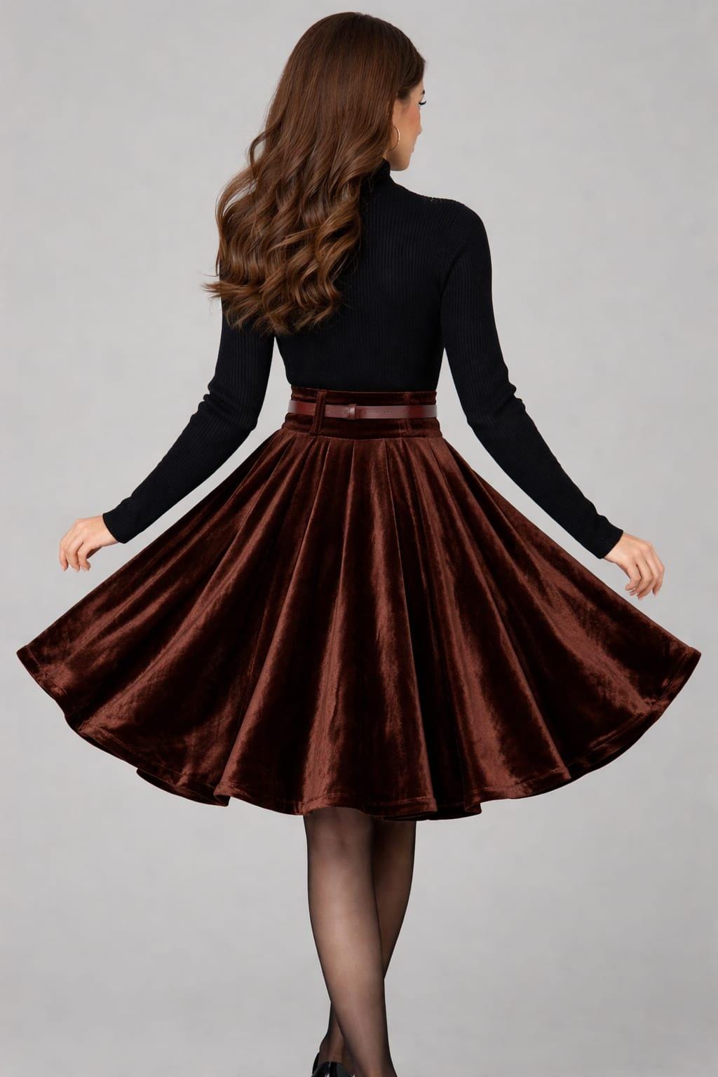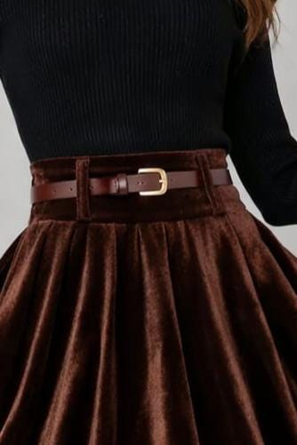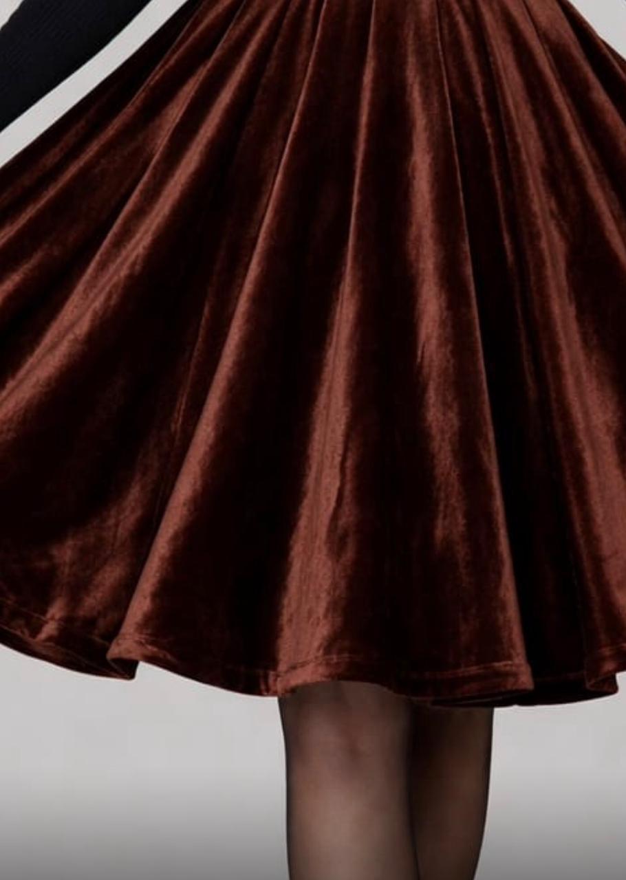Women’s Brown Velvet Skirt , High Waist Flared Midi Skirt , Vintage Elegant Winter Skirt , Retro Party Wear for Women