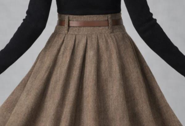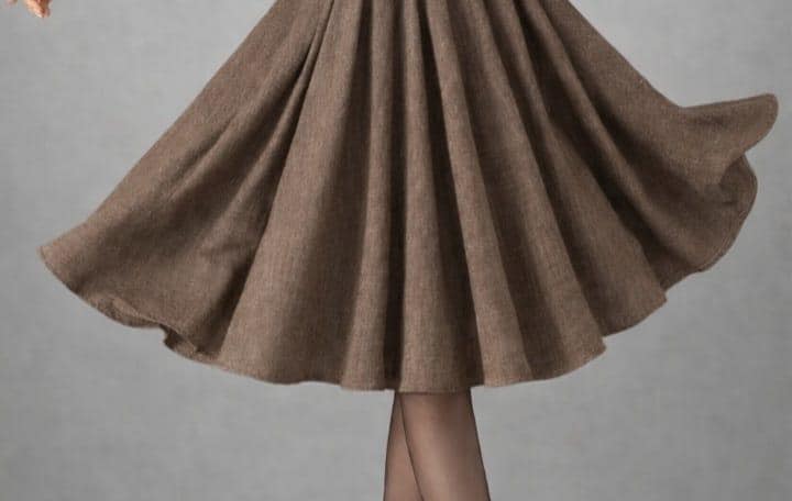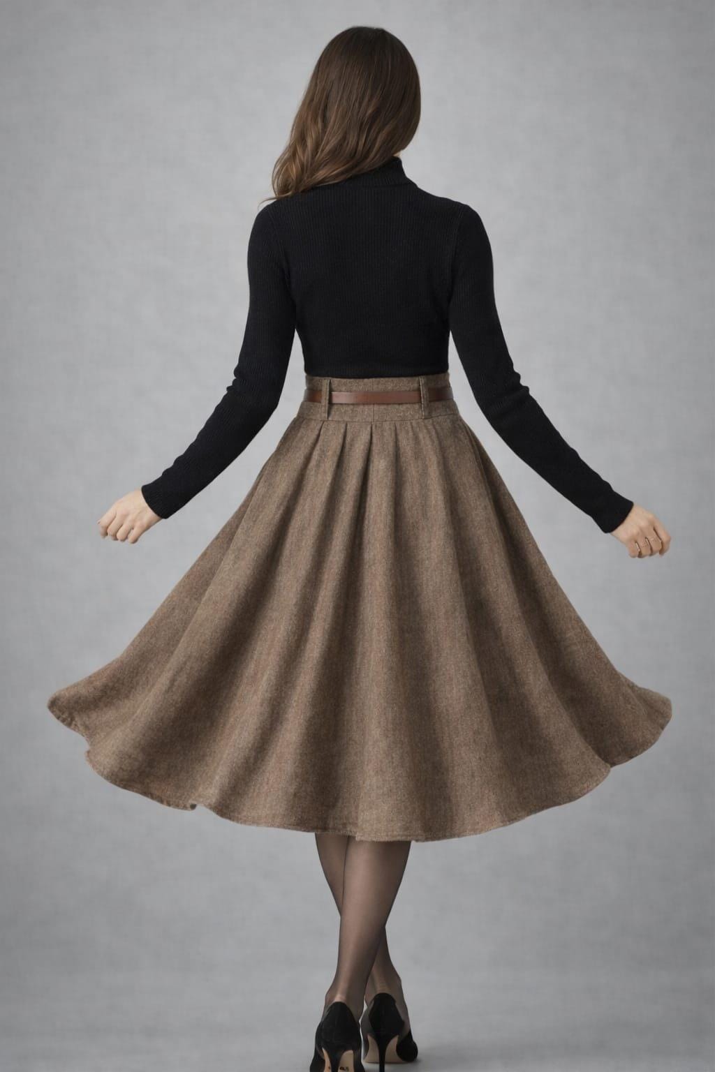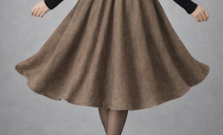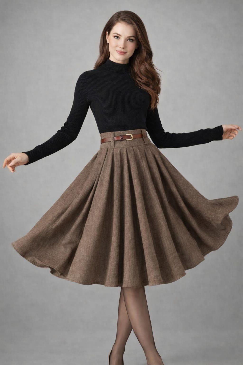 Add timeless elegance to your wardrobe with this vintage-inspired brown wool midi skirt, designed with a high-waisted pleated A-line silhouette that flatters every body type. The soft wool-look fabric drapes beautifully, creating graceful movement with every step.
