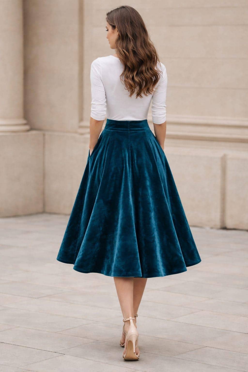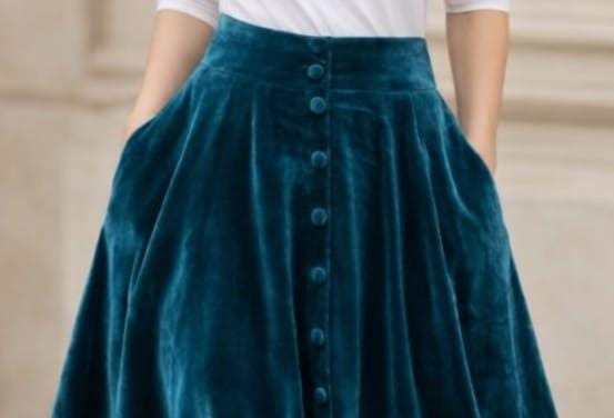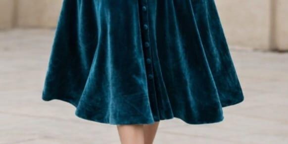 Add timeless elegance to your wardrobe with this luxurious teal velvet midi skirt, designed for women who love classic vintage fashion with a modern touch. This high-waisted A-line skirt features a flattering silhouette, soft premium velvet fabric, and a beautiful button-down front that enhances its sophisticated charm.