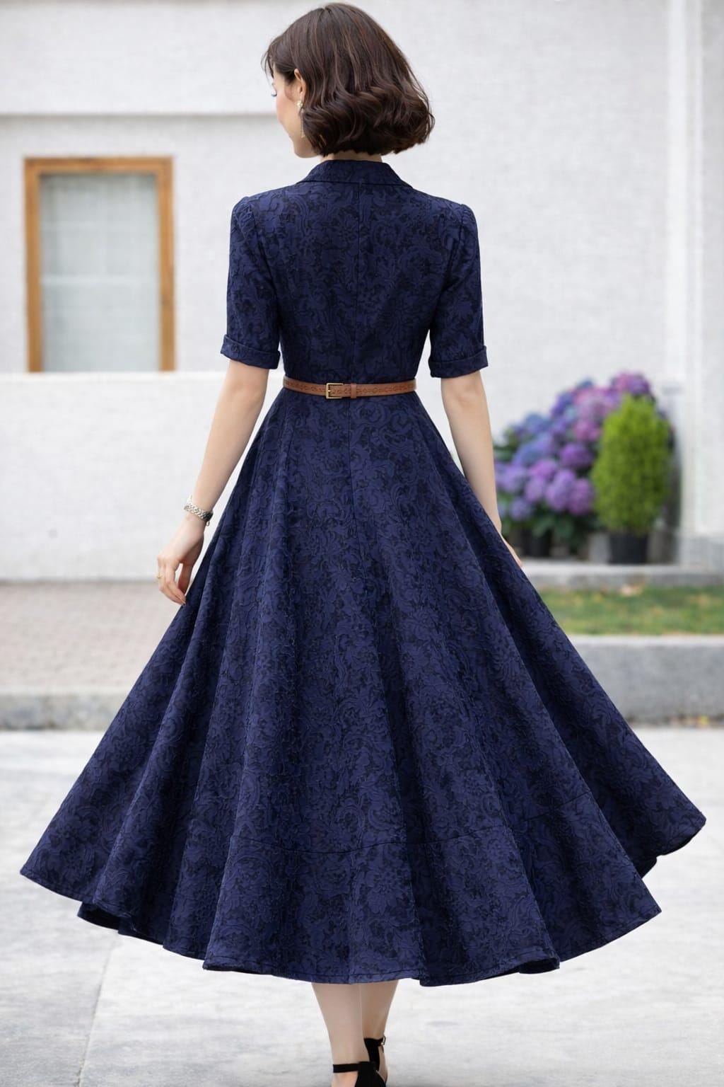 Navy Blue Brocade Midi Dress for Women , Vintage Fit and Flare Dress , Elegant Belted Formal Evening Dress