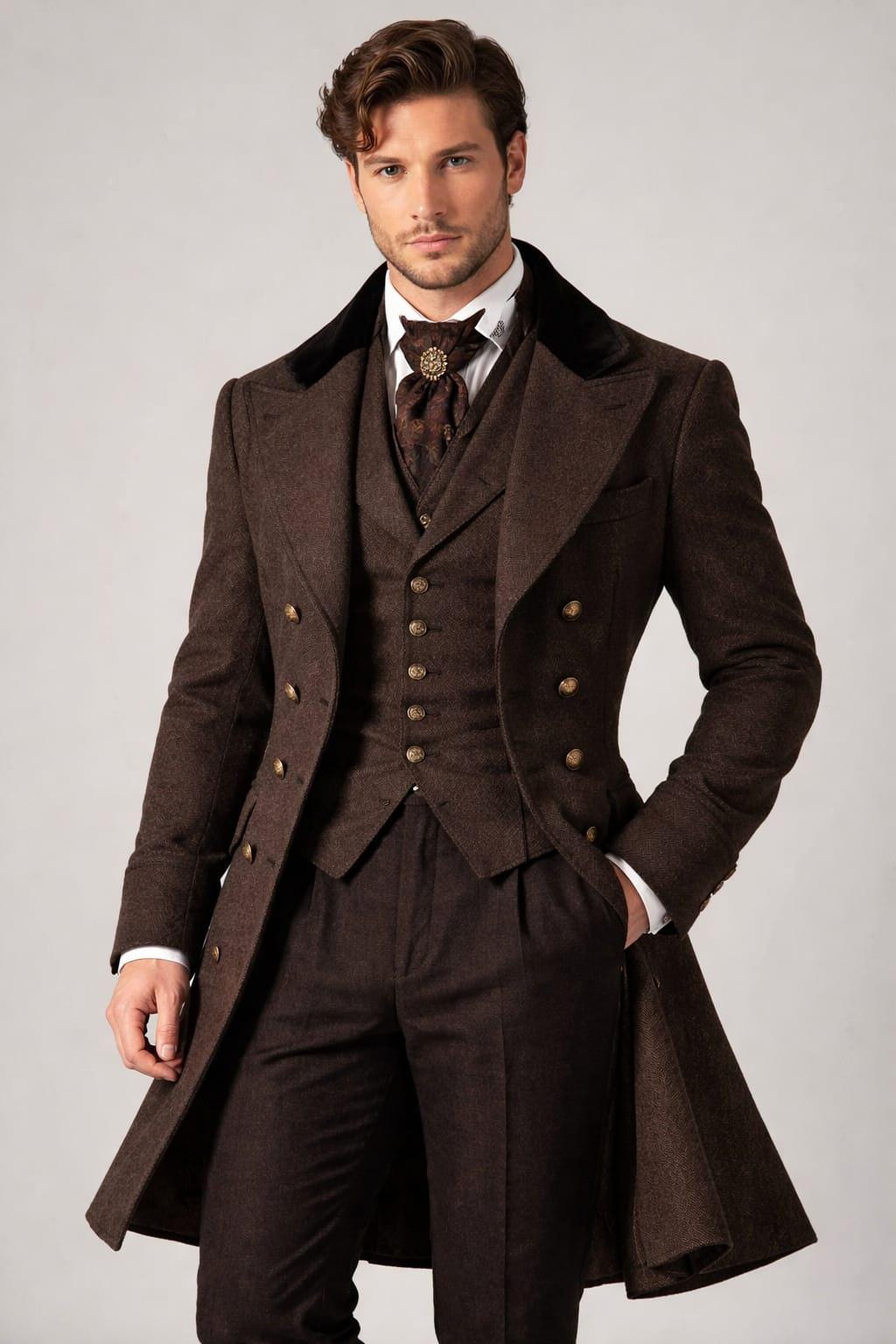 Step into timeless elegance with this Men’s Victorian Frock Coat, inspired by authentic 19th-century Edwardian and Victorian tailoring. Crafted in a rich brown tone with a structured silhouette, this coat is designed for gentlemen who appreciate historical fashion, steampunk aesthetics, and classic formalwear.