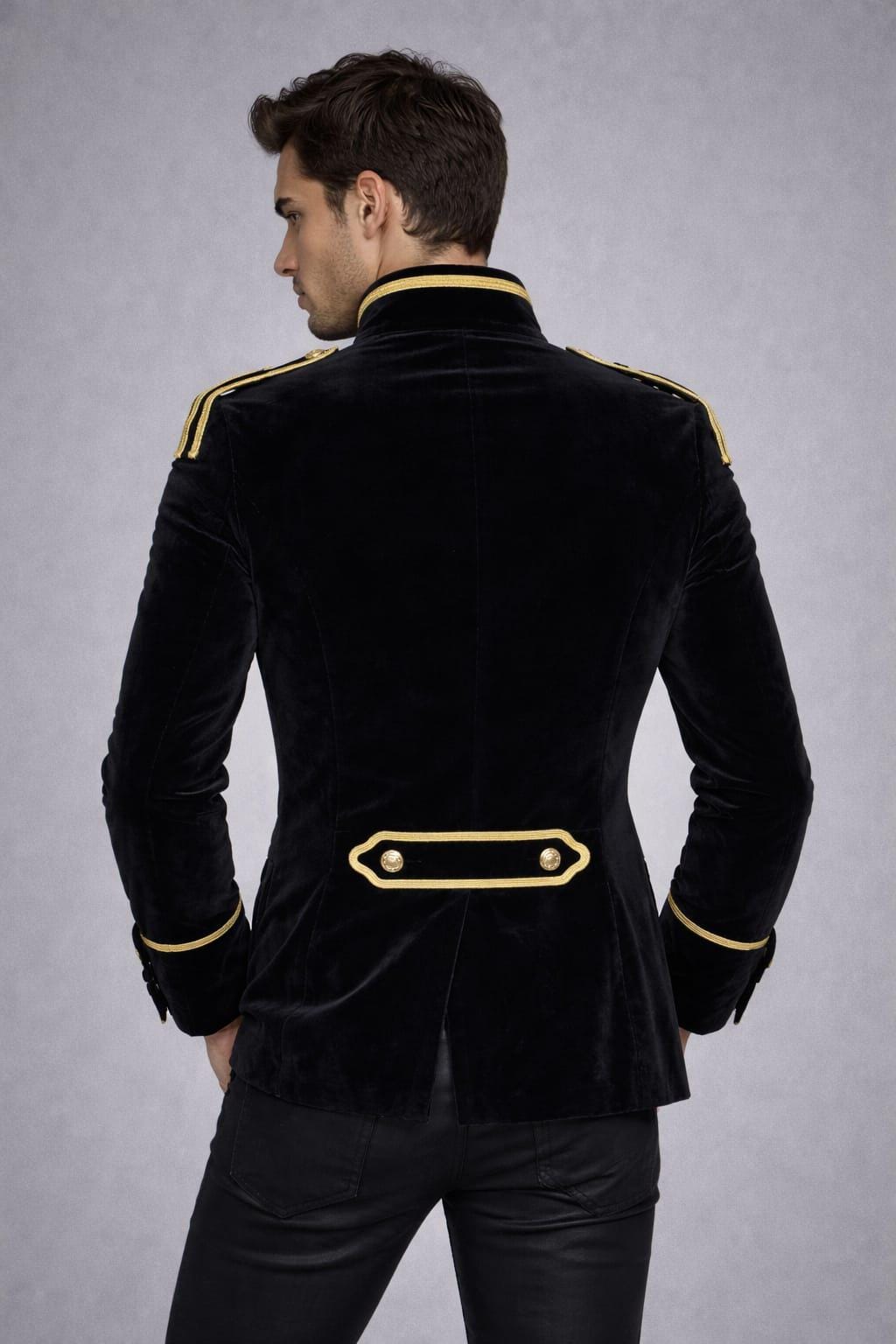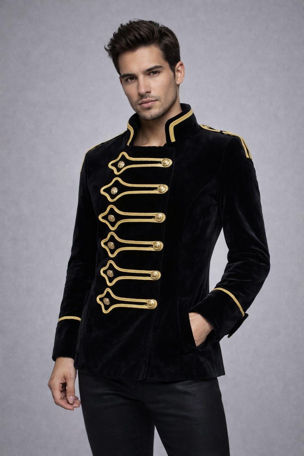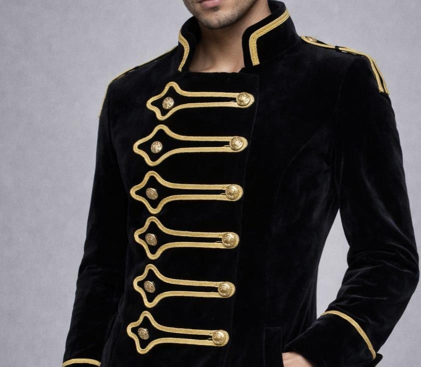 Make a bold statement with this men’s black velvet military jacket, inspired by Victorian, Gothic, and Hussar band uniforms. Crafted from luxurious velvet fabric, this jacket features ornate gold braiding, decorative buttons, and a structured high collar, delivering a powerful, elegant silhouette.