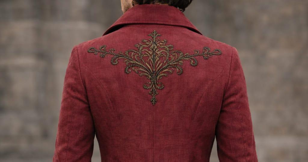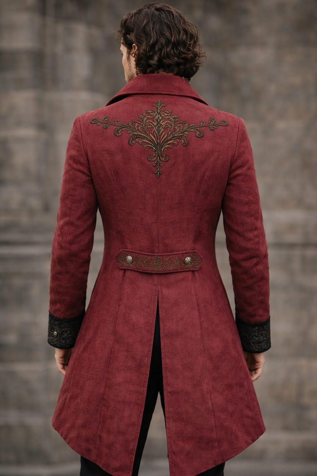 The back showcases an embroidered royal motif with decorative waist strap, adding a luxurious finish that stands out from mass-produced coats. A must-have piece for lovers of Victorian, medieval, renaissance, and gothic fashion.