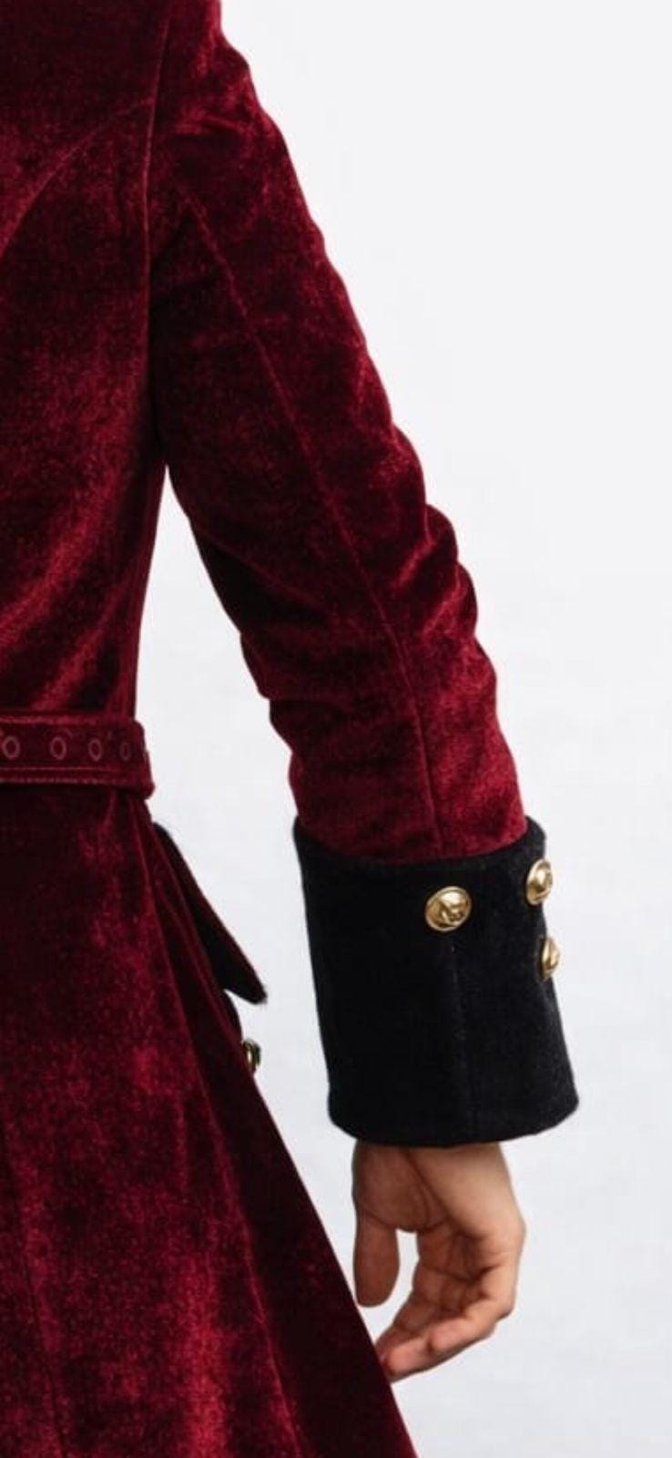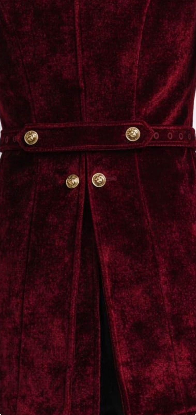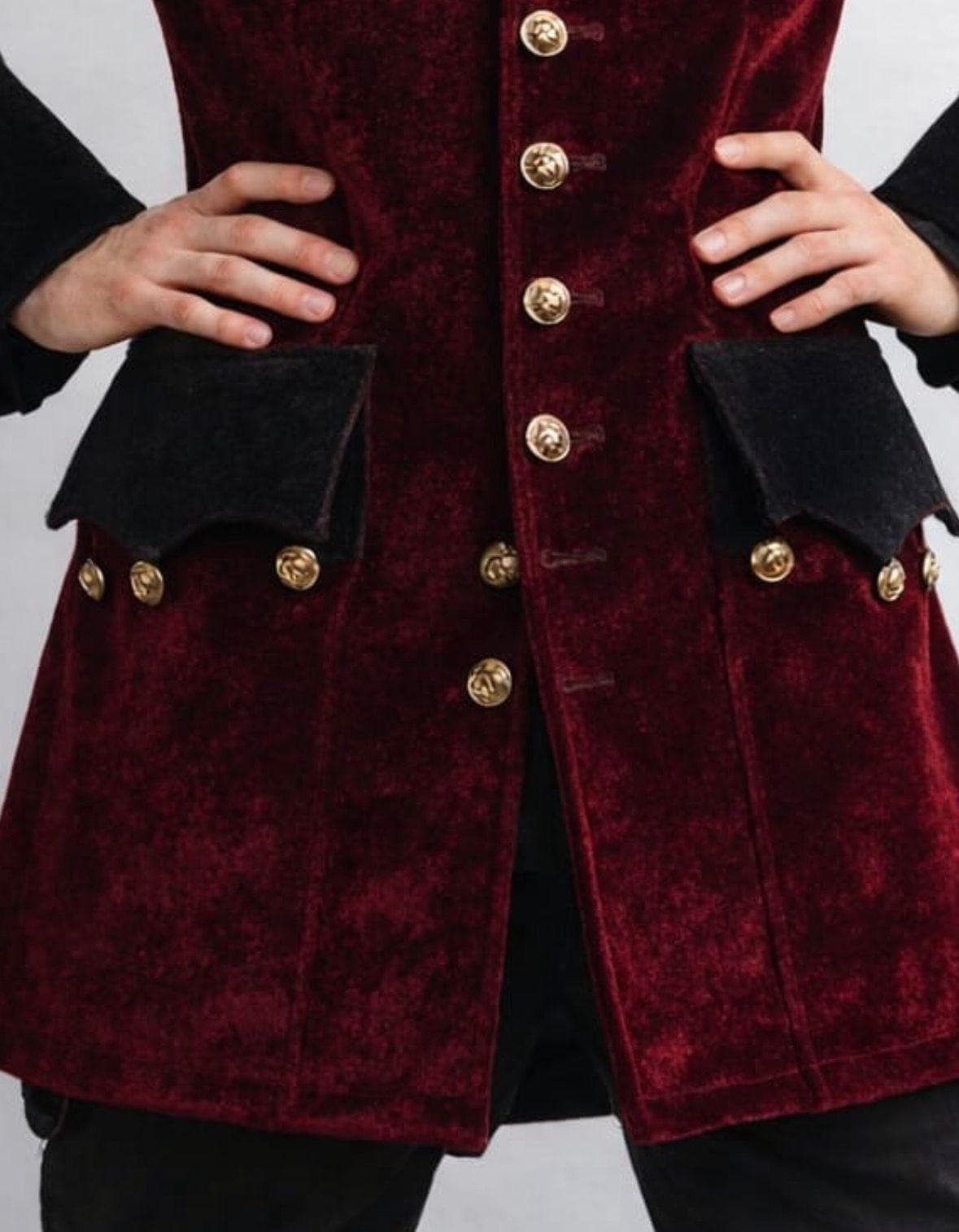 Made from rich velvet fabric, the coat features gold metal buttons, contrasting black cuffs, and a tailored long silhouette that enhances a gentlemanly and powerful look. Whether you’re portraying a pirate captain, Victorian nobleman, or gothic steampunk hero, this coat delivers authenticity and sophistication.