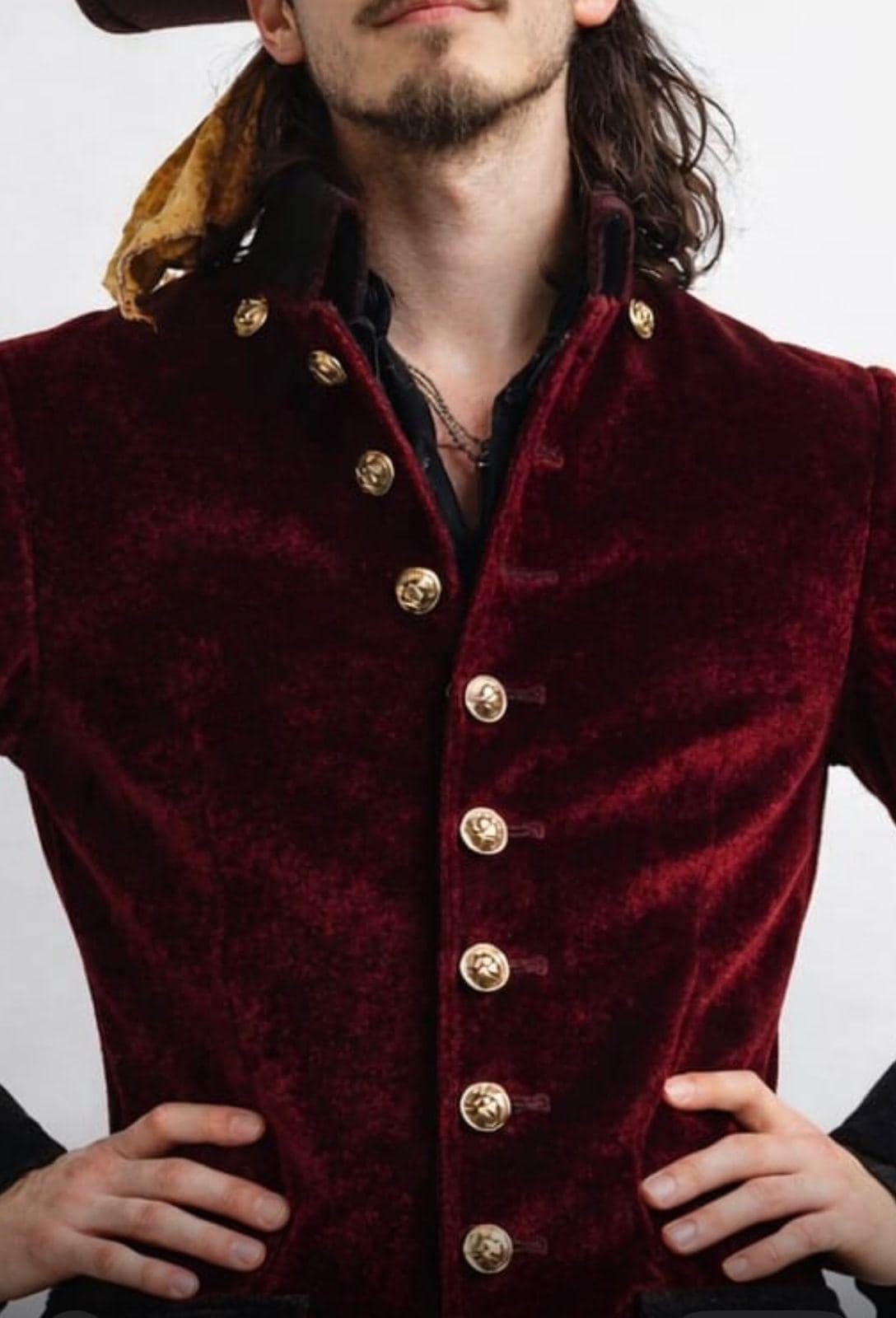 Step into timeless elegance with this Men’s Burgundy Velvet Pirate Coat, inspired by Victorian, Renaissance, and Steampunk fashion. Crafted for those who appreciate historical drama and bold style, this long frock coat is perfect for cosplay, reenactments, theater, LARP, Halloween, and steampunk events.