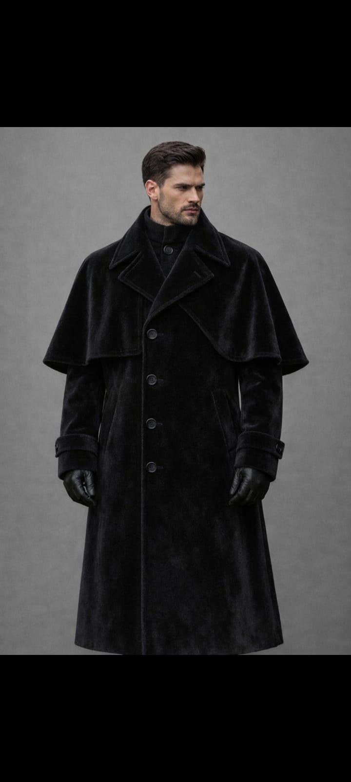 Elevate your style with this Men’s Black Velvet Cape Coat, a timeless statement piece inspired by Victorian elegance, Gothic fashion, and Steampunk aesthetics. Designed for modern gentlemen who appreciate classic craftsmanship, this long overcoat features a dramatic shoulder cape, structured tailoring, and a luxurious velvet finish.