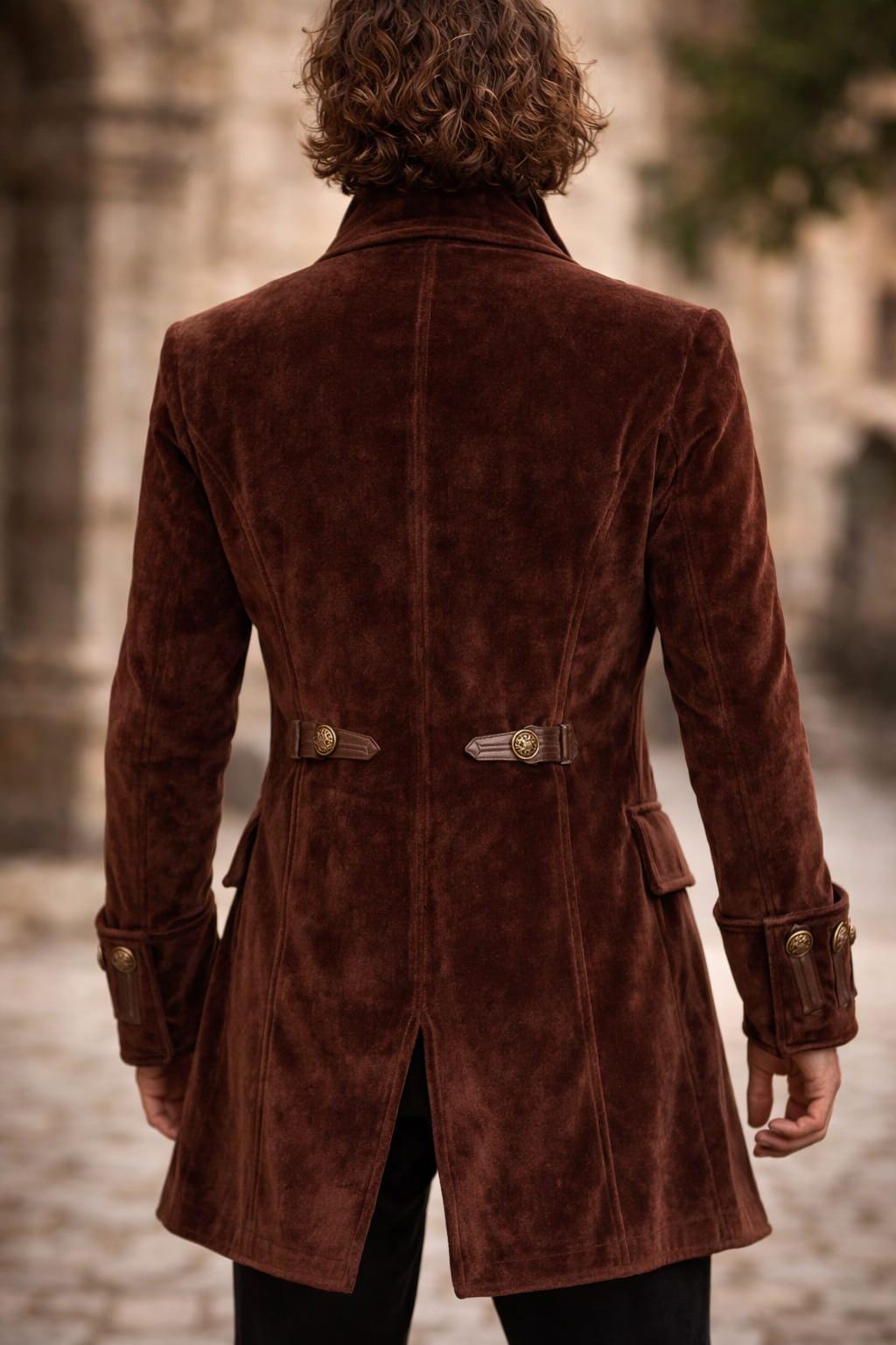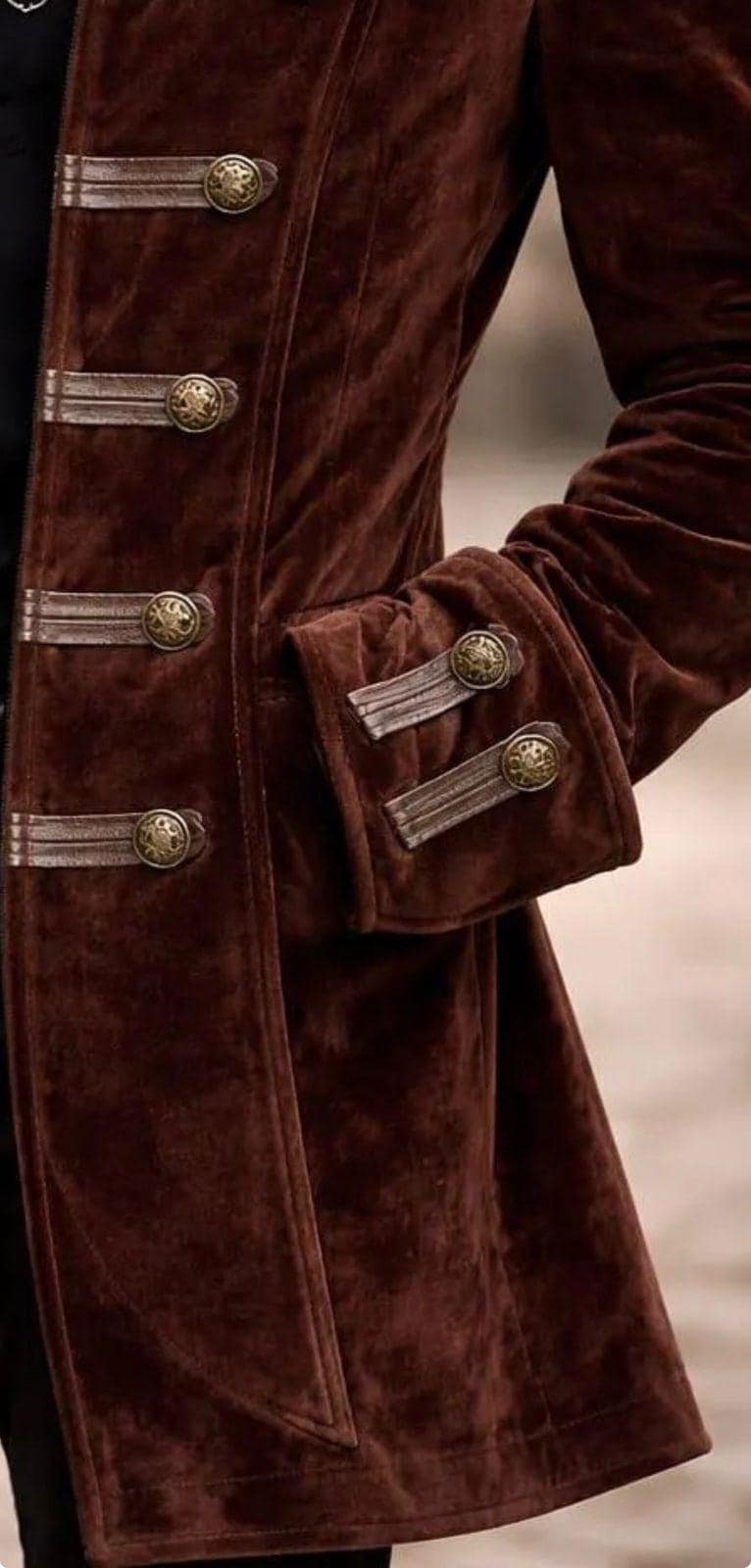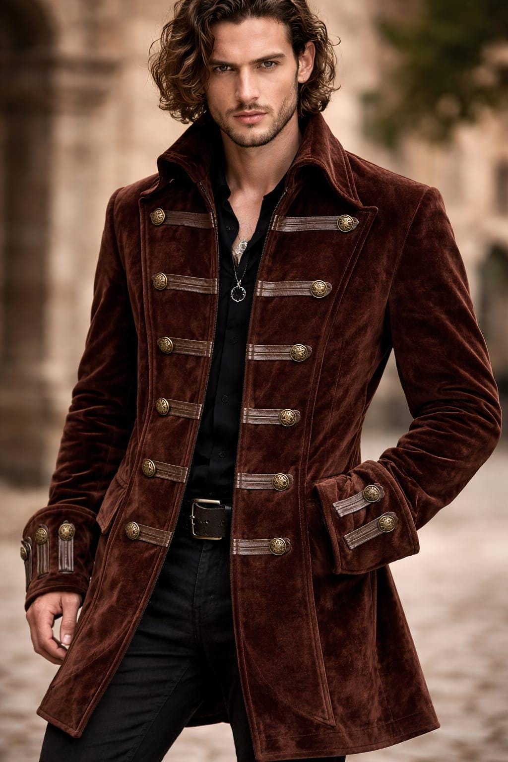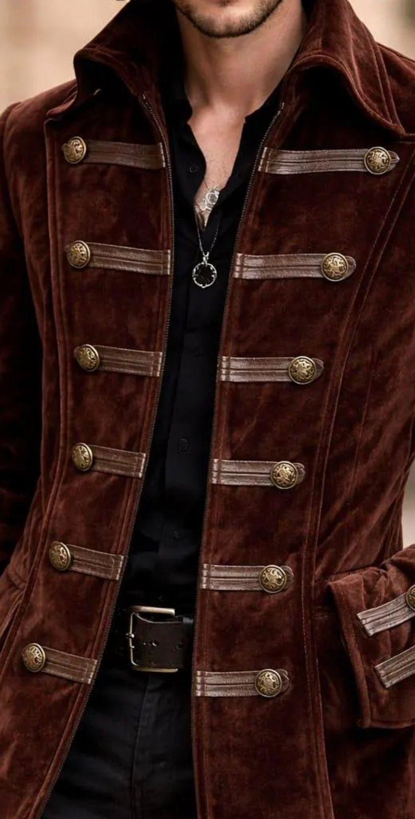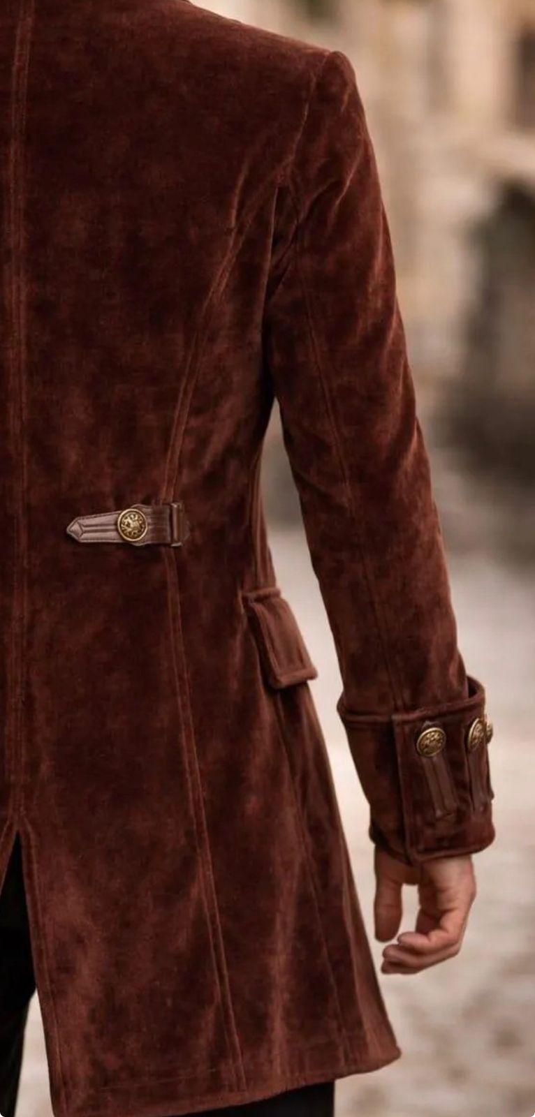 Make a bold statement with this luxury men’s brown velvet military coat, inspired by Victorian, gothic, and steampunk fashion. Designed for men who appreciate timeless elegance, this long coat features decorative brass buttons, a structured military silhouette, and rich velvet fabric for a premium look.