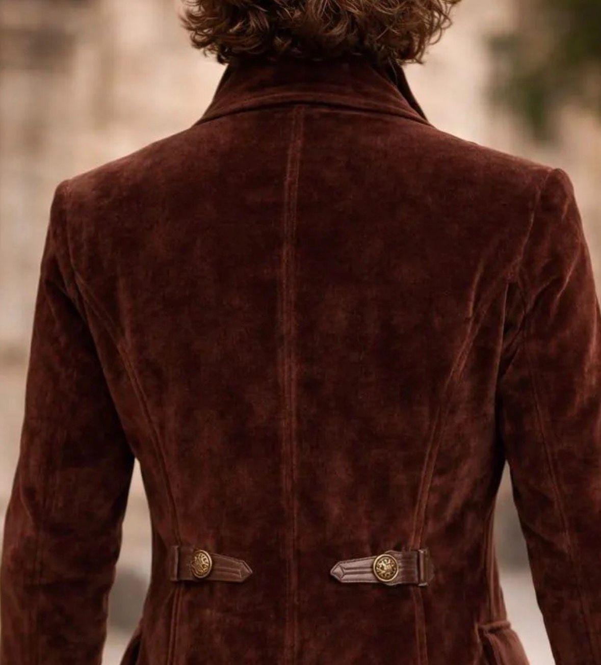 Men’s Brown Velvet Military Coat – Victorian Gothic Steampunk Jacket, Double Breasted Winter Long Coat for Men