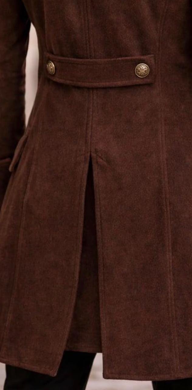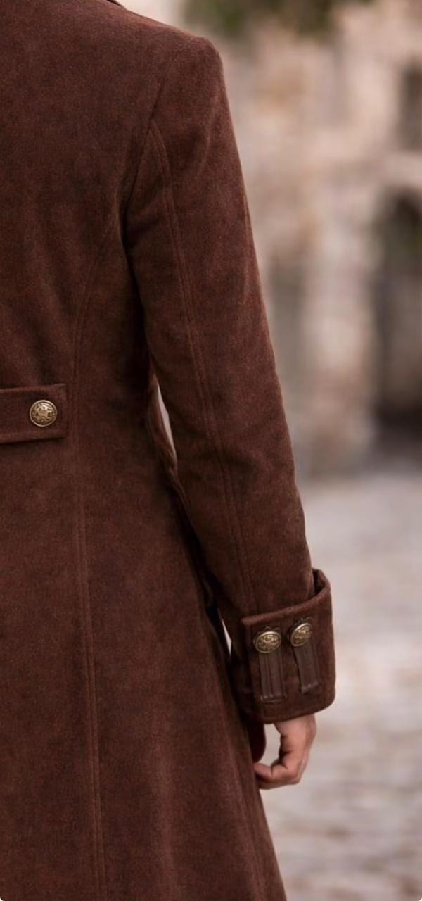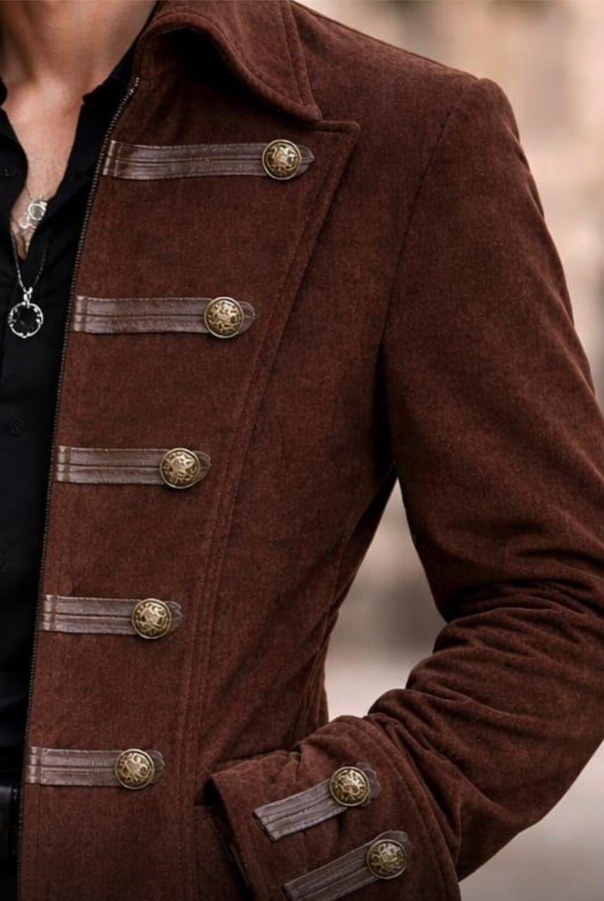 Upgrade your wardrobe with this men’s Victorian military long coat, crafted for timeless elegance and bold character. Featuring a structured silhouette, decorative brass buttons, and rich brown fabric, this coat draws inspiration from Victorian, gothic, and steampunk fashion.