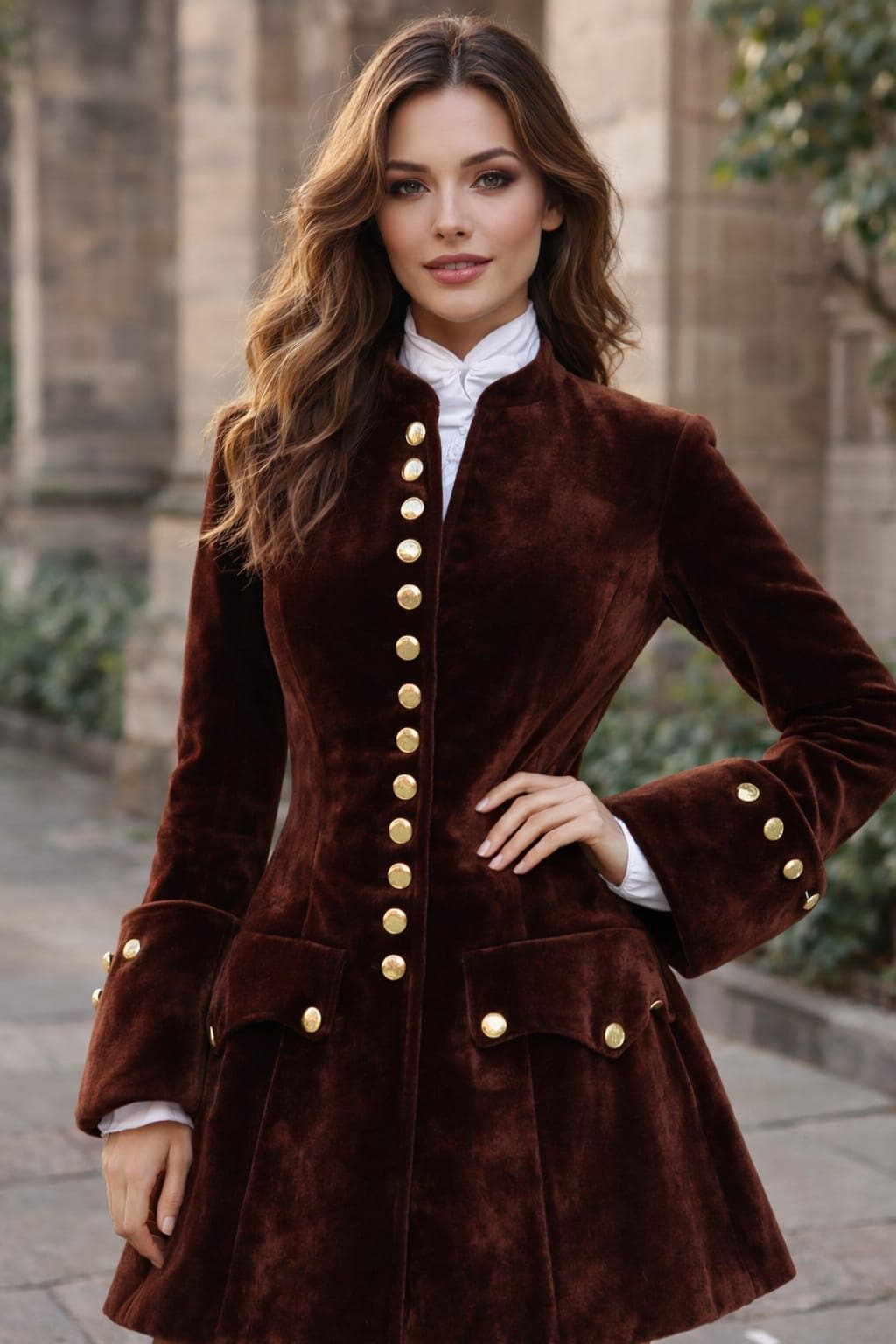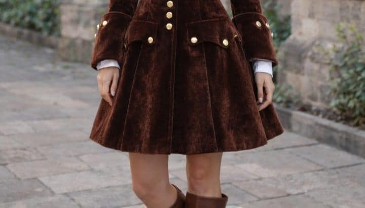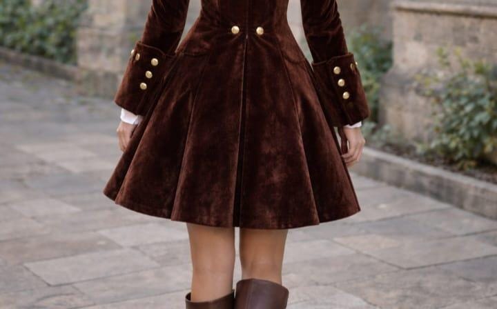 Step into timeless elegance with this Vintage Military Velvet Coat Dress for Women, designed to blend luxury, sophistication, and classic Victorian charm. Crafted from premium soft brown velvet, this dress features a beautifully structured silhouette, accentuated with gold military buttons, flared cuffs, and a graceful A-line skirt.
