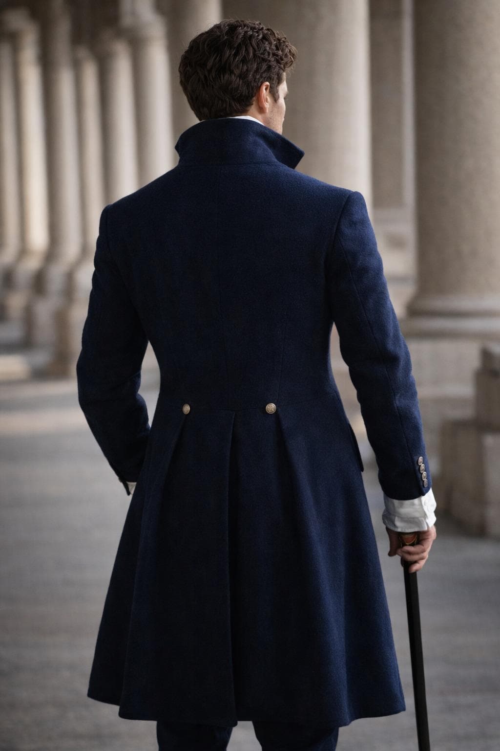 Long frock coat design with a fitted waist