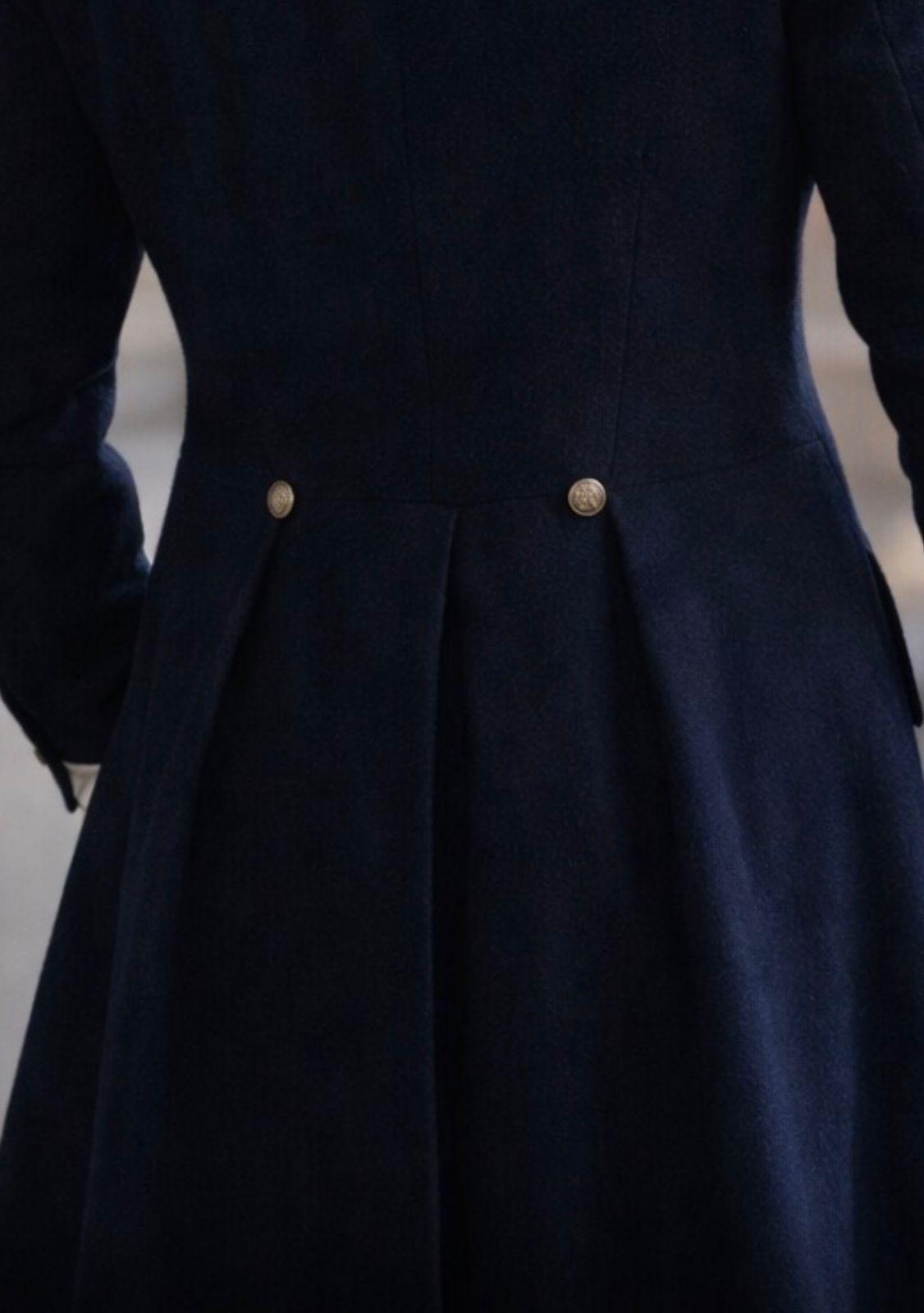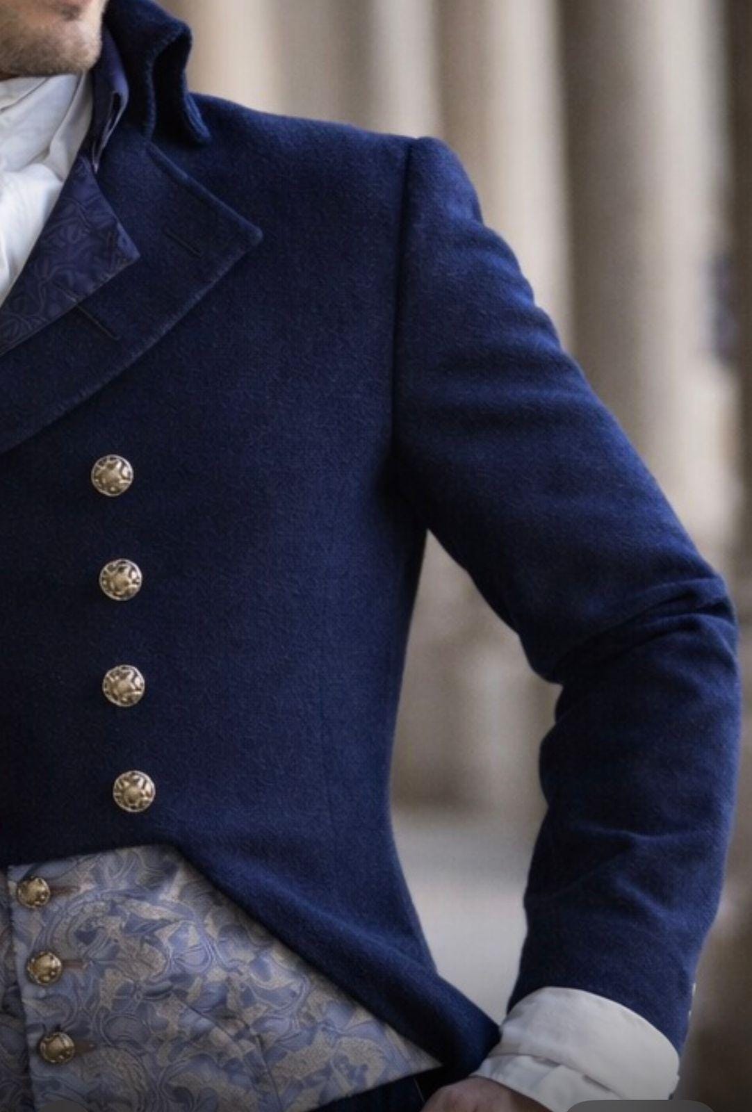 Crafted with stunning attention to detail, this luxurious navy blue frock coat features a double-breasted front, gold accent buttons, and a refined silhouette perfect for formal occasions, cosplay, themed events, and historical reenactments.