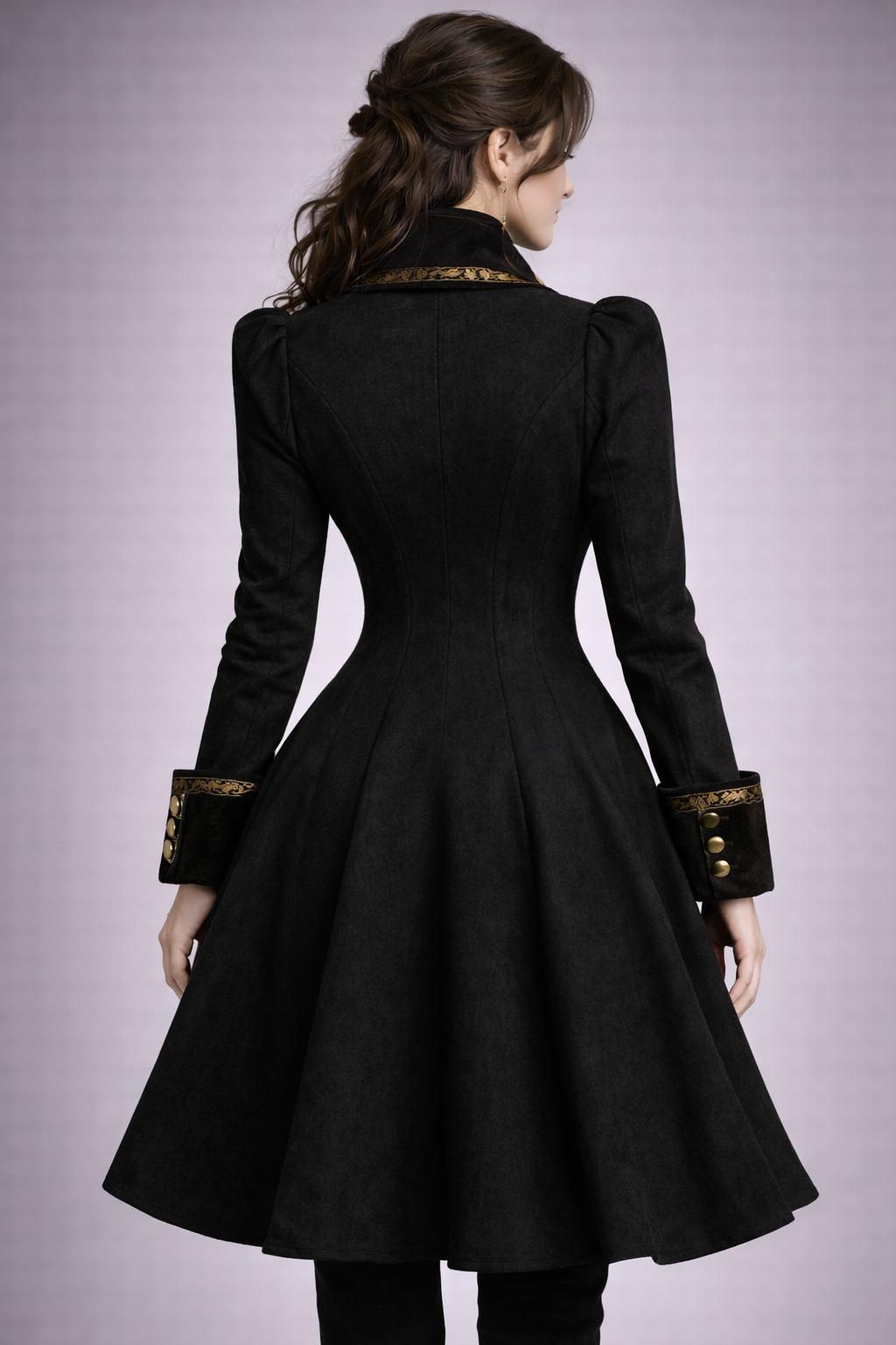 Step into timeless elegance with this Victorian-inspired black tailcoat jacket, designed for women who love classic sophistication with a bold edge. Featuring a structured silhouette, luxurious detailing, and ornate gold embroidery, this jacket blends gothic glamour, steampunk aesthetics, and military style into one striking piece.