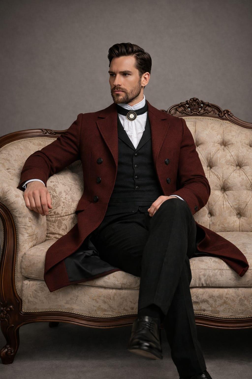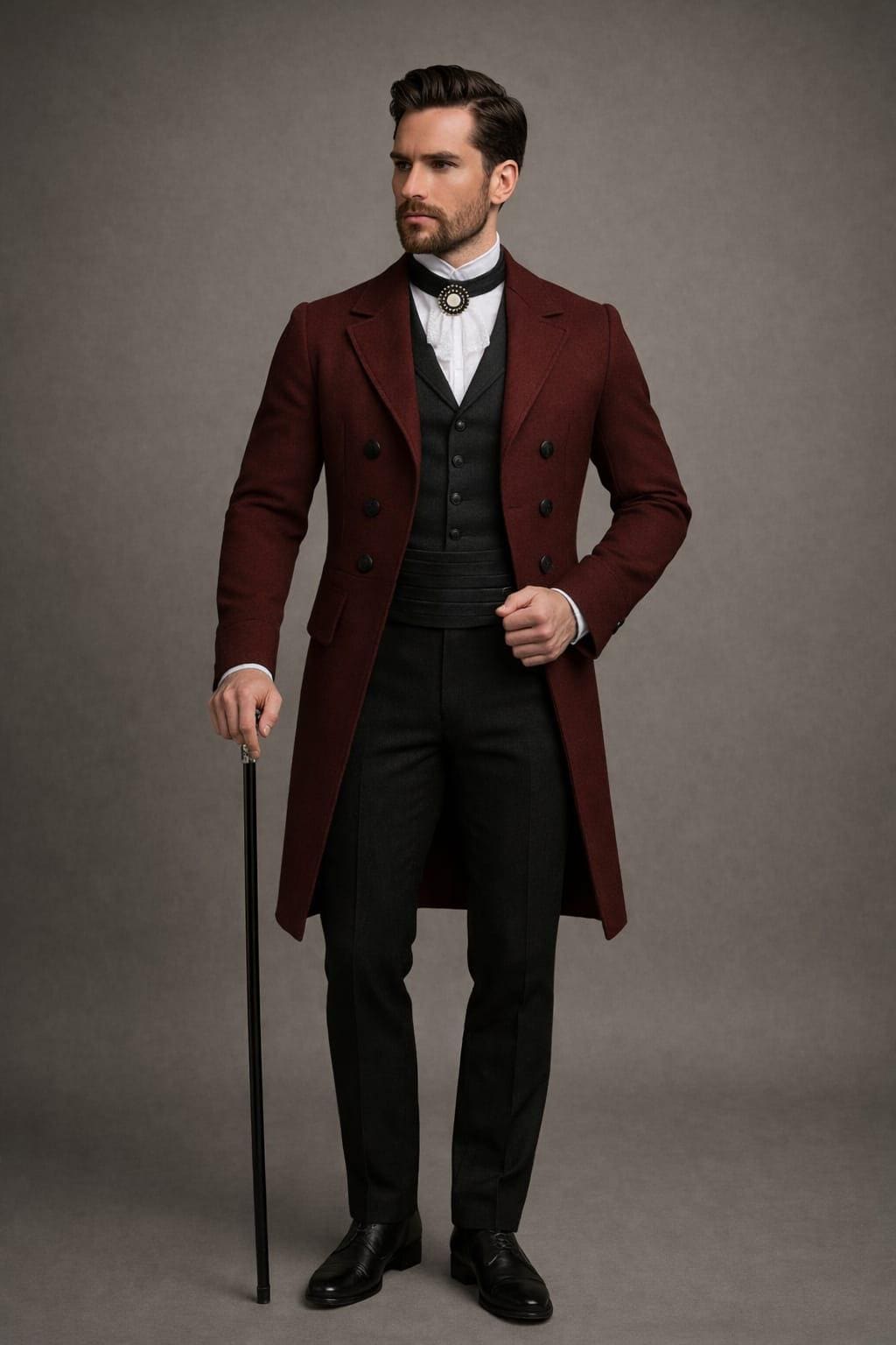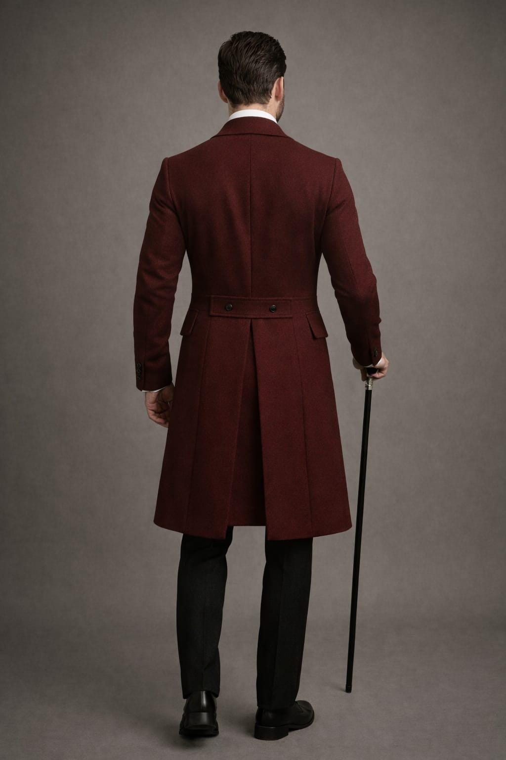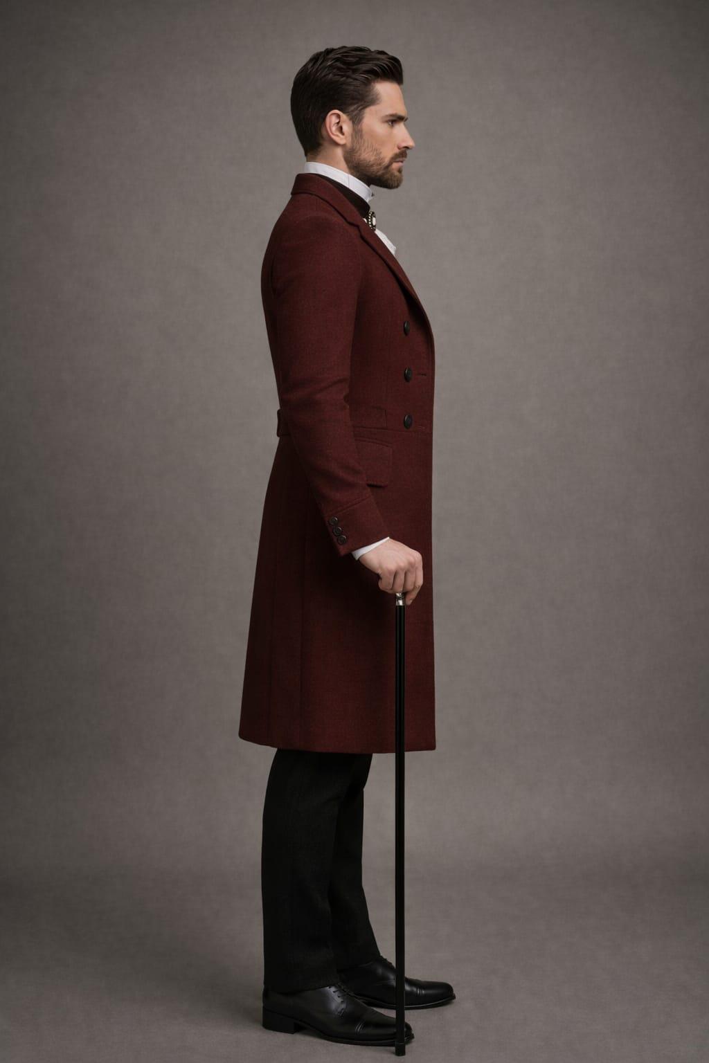 Step into timeless elegance with this Victorian-inspired burgundy wool coat for men, designed for the modern gentleman who appreciates classic style. Featuring a double-breasted front, tailored silhouette, and rich wine-red tone, this coat blends vintage sophistication with steampunk and gothic aesthetics.