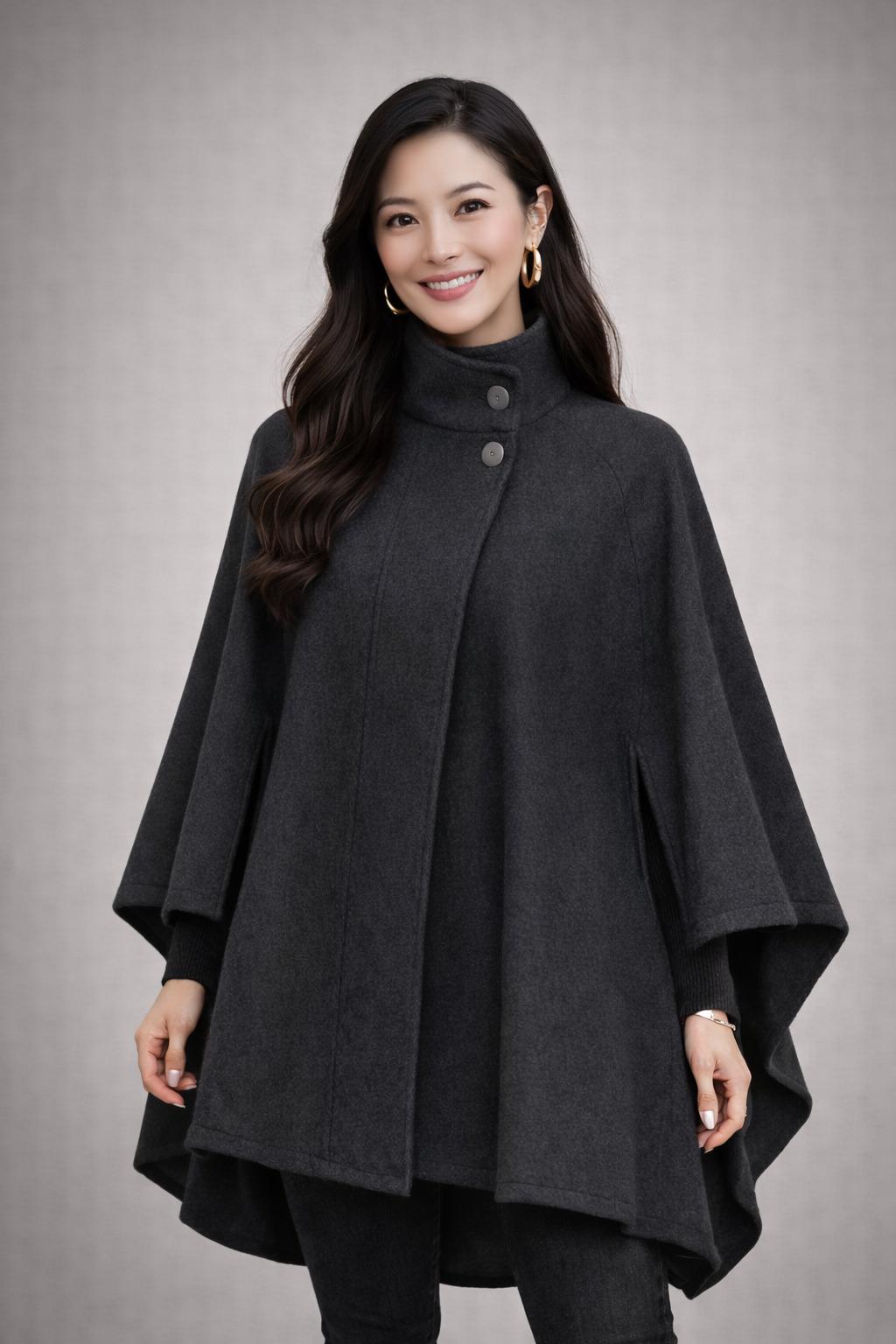Women’s Wool Cape Coat | Elegant Winter Poncho Jacket | High Neck Button Cape | Minimalist Oversized Wool Coat | Fall Winter Outerwear