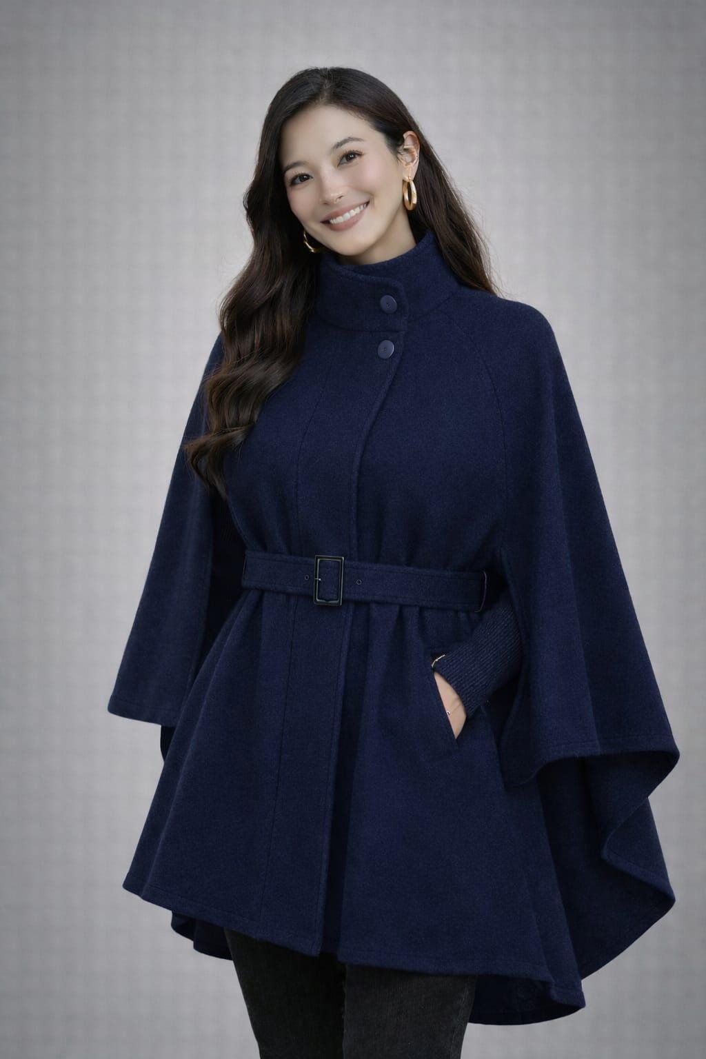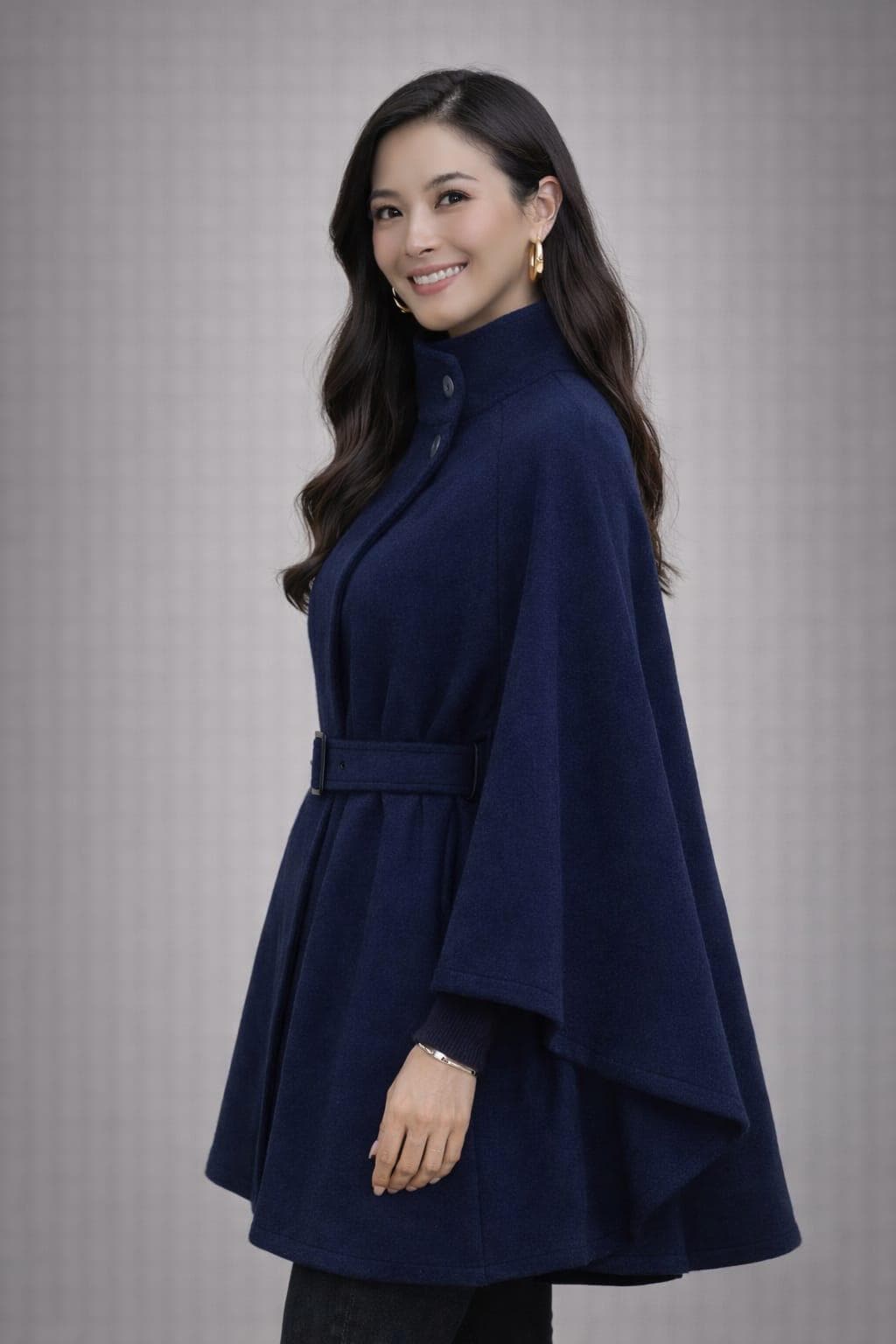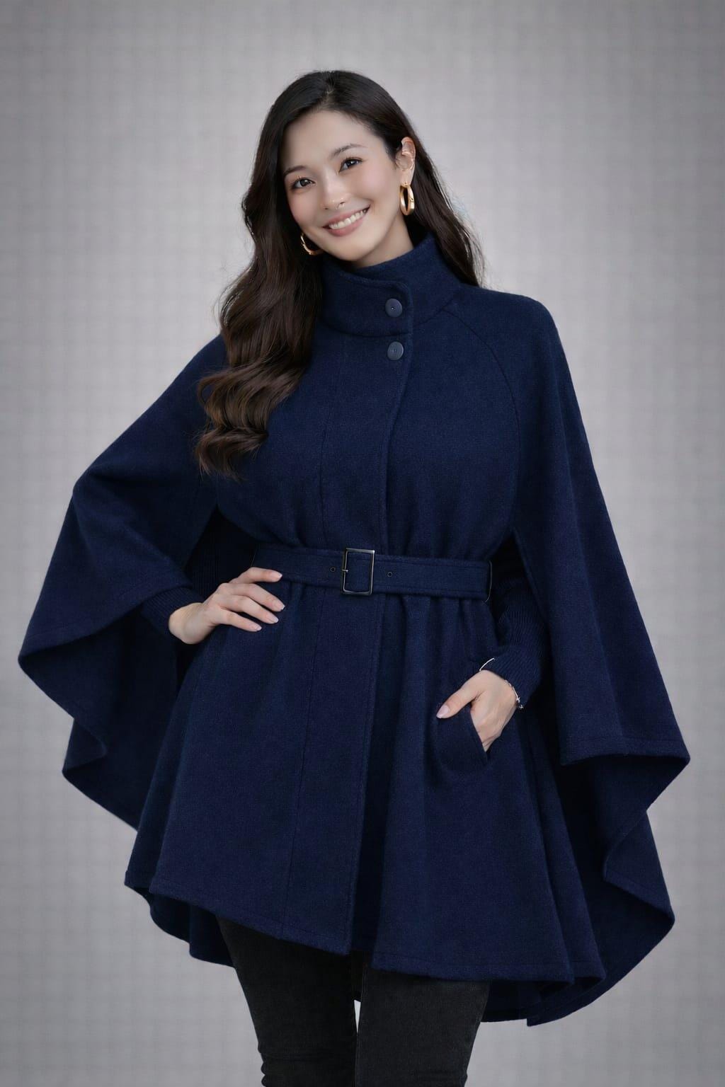 Whether you’re looking for a chic statement piece or versatile outerwear, this navy cape coat blends style, comfort, and elegance.
