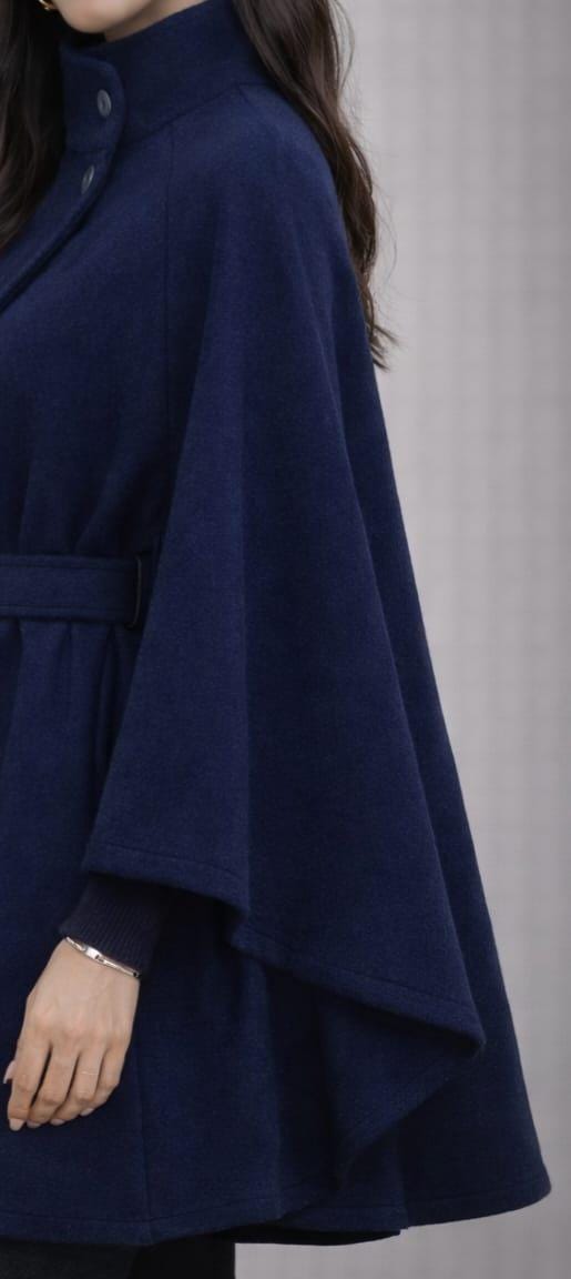 Elevate your winter wardrobe with this elegant navy blue cape coat, designed for timeless sophistication and everyday comfort. Crafted from premium-quality wool blend fabric, this belted poncho-style coat features a structured high collar, clean lines, and a flattering silhouette.