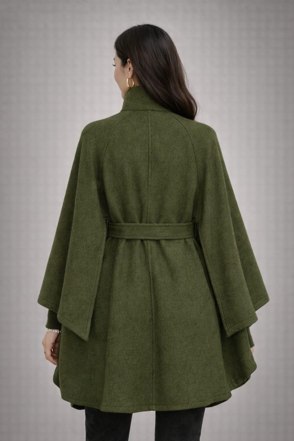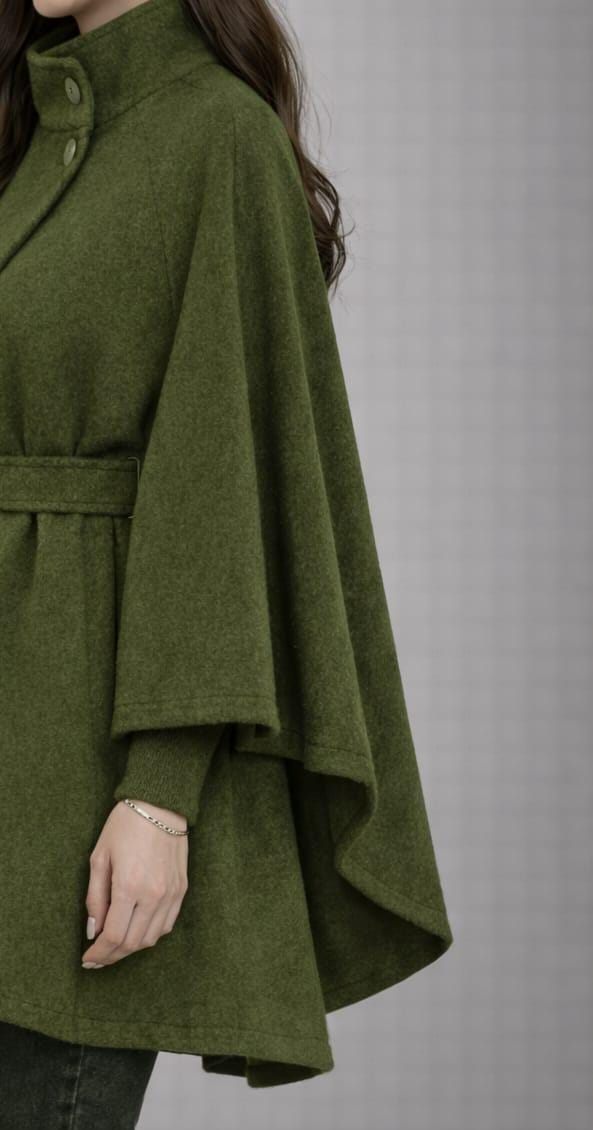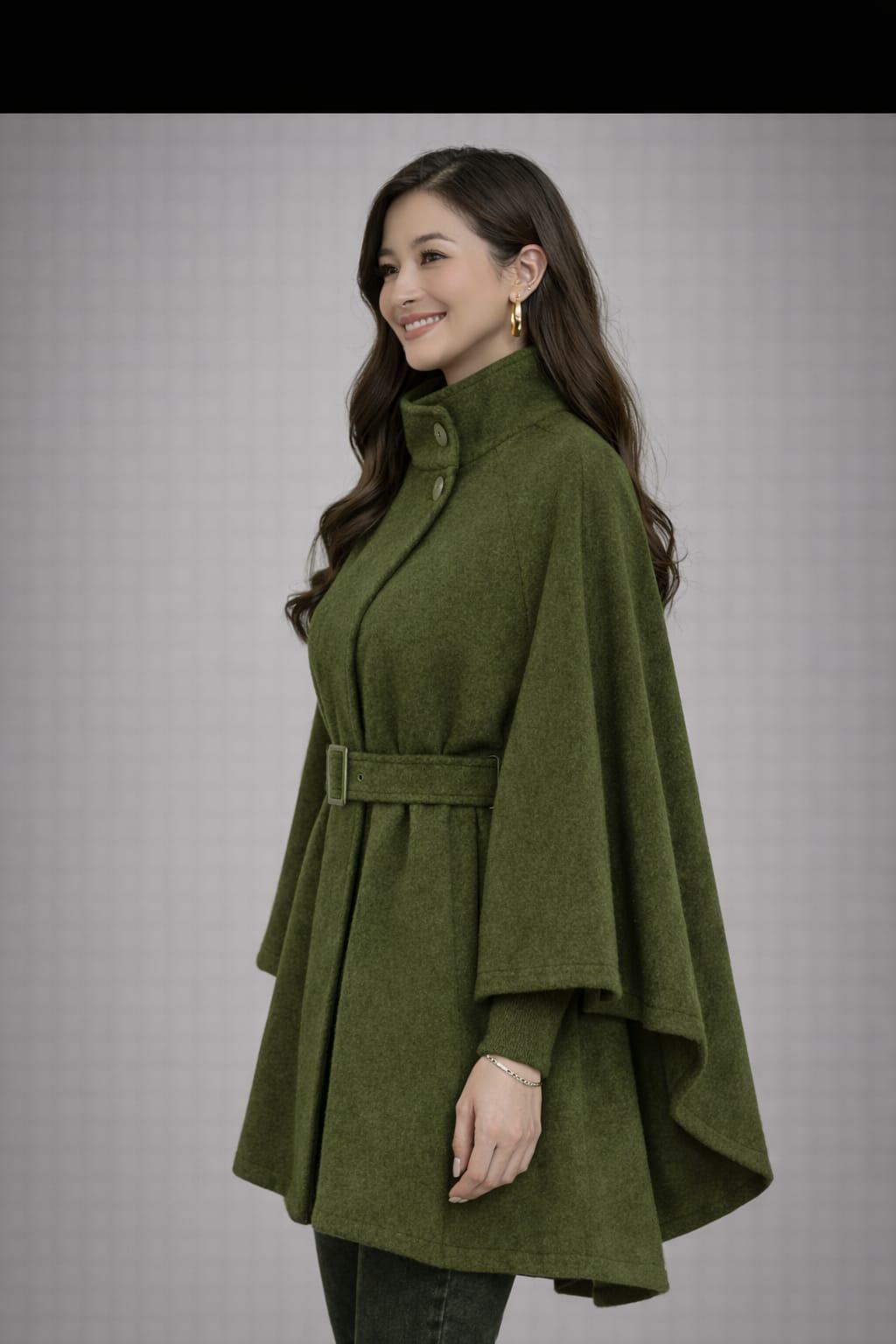 Stay warm and stylish with this Elegant Green Cape Coat for Women, designed for modern fashion lovers who want comfort and sophistication in one outfit. This belted poncho-style coat features a flattering high neckline with button detail and a flowing cape silhouette that adds effortless elegance to any look.