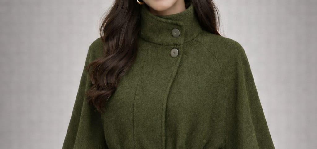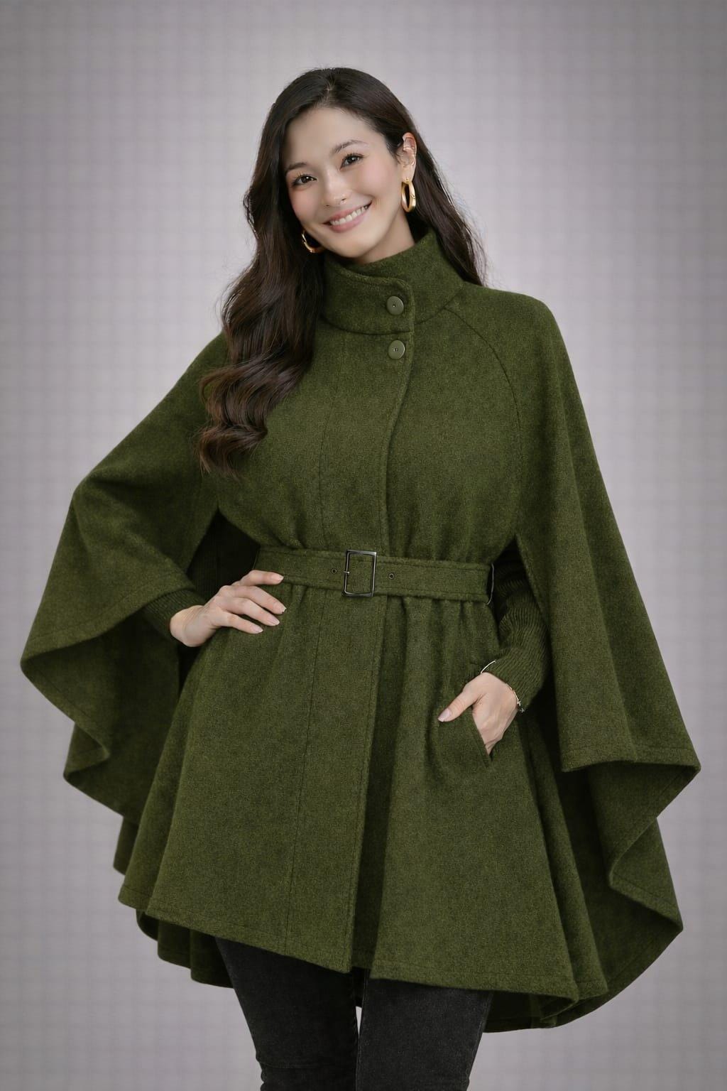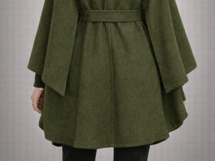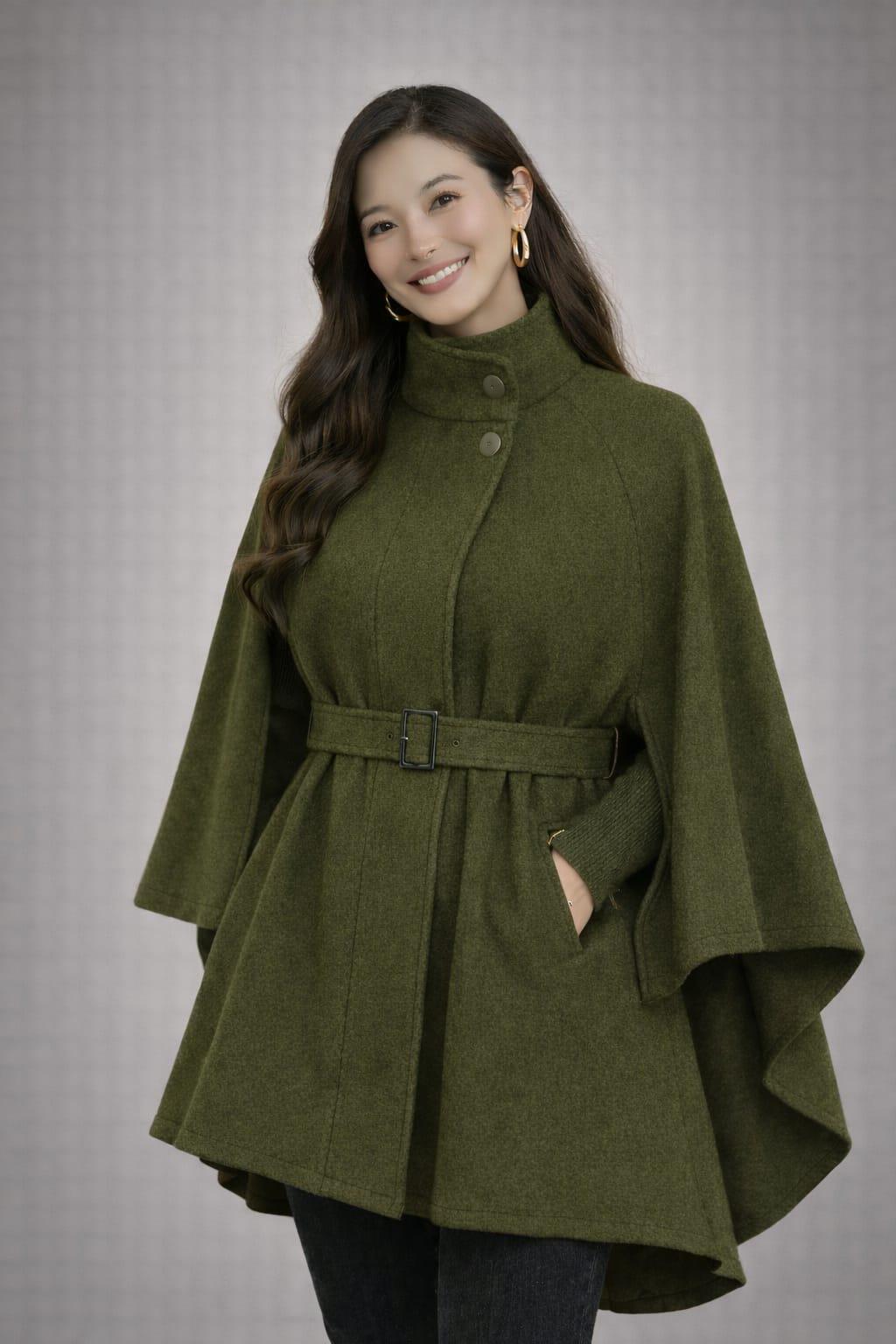 Stay warm and stylish with this Elegant Green Cape Coat for Women, designed for modern fashion lovers who want comfort and sophistication in one outfit. This belted poncho-style coat features a flattering high neckline with button detail and a flowing cape silhouette that adds effortless elegance to any look.