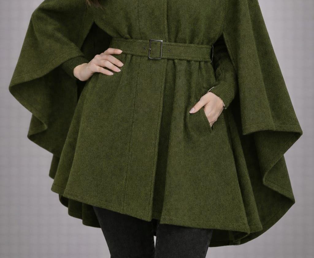 Women Green Cape Coat with Belt – Winter Wool Poncho Coat, High Neck Buttoned Cloak Jacket, Elegant Oversized Wrap Coat, Fall Fashion Outerwear Gift
