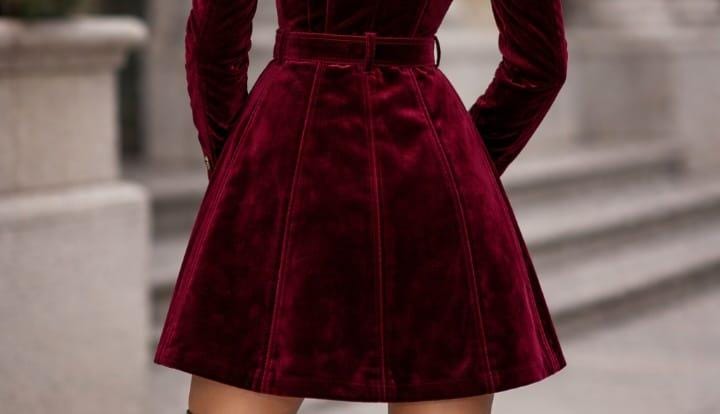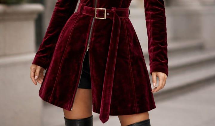 Burgundy Velvet Trench Coat - Fit & Flare Belted Winter Jacket