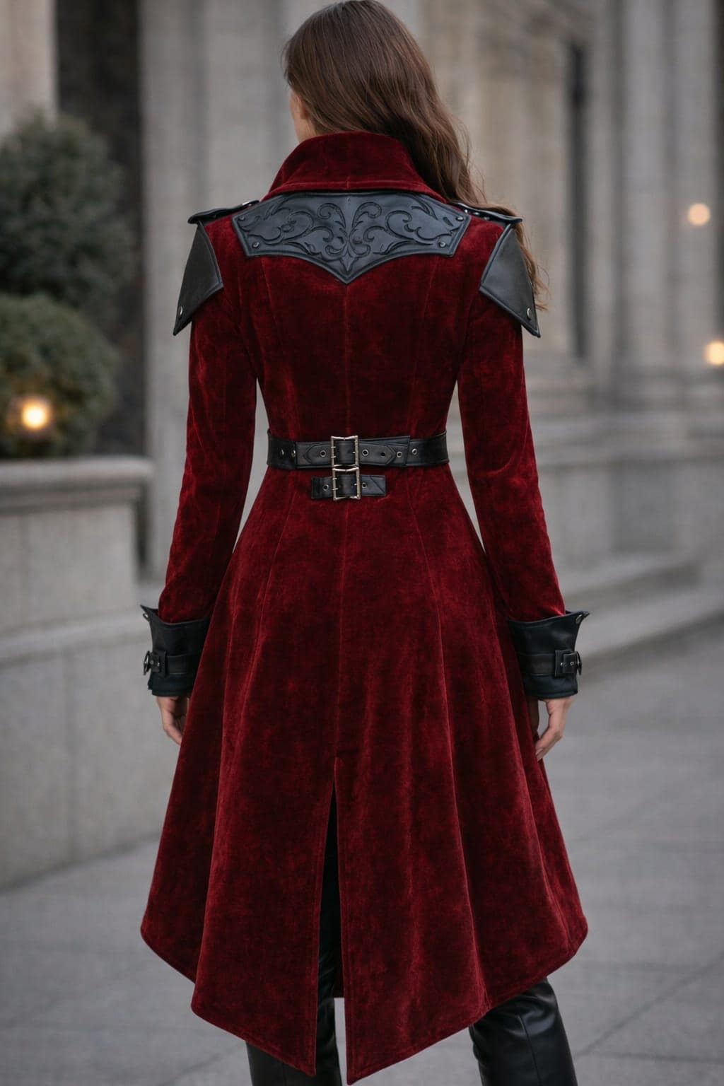 Gothic Red Velvet Coat – Victorian Steampunk Long Trench with Leather Details